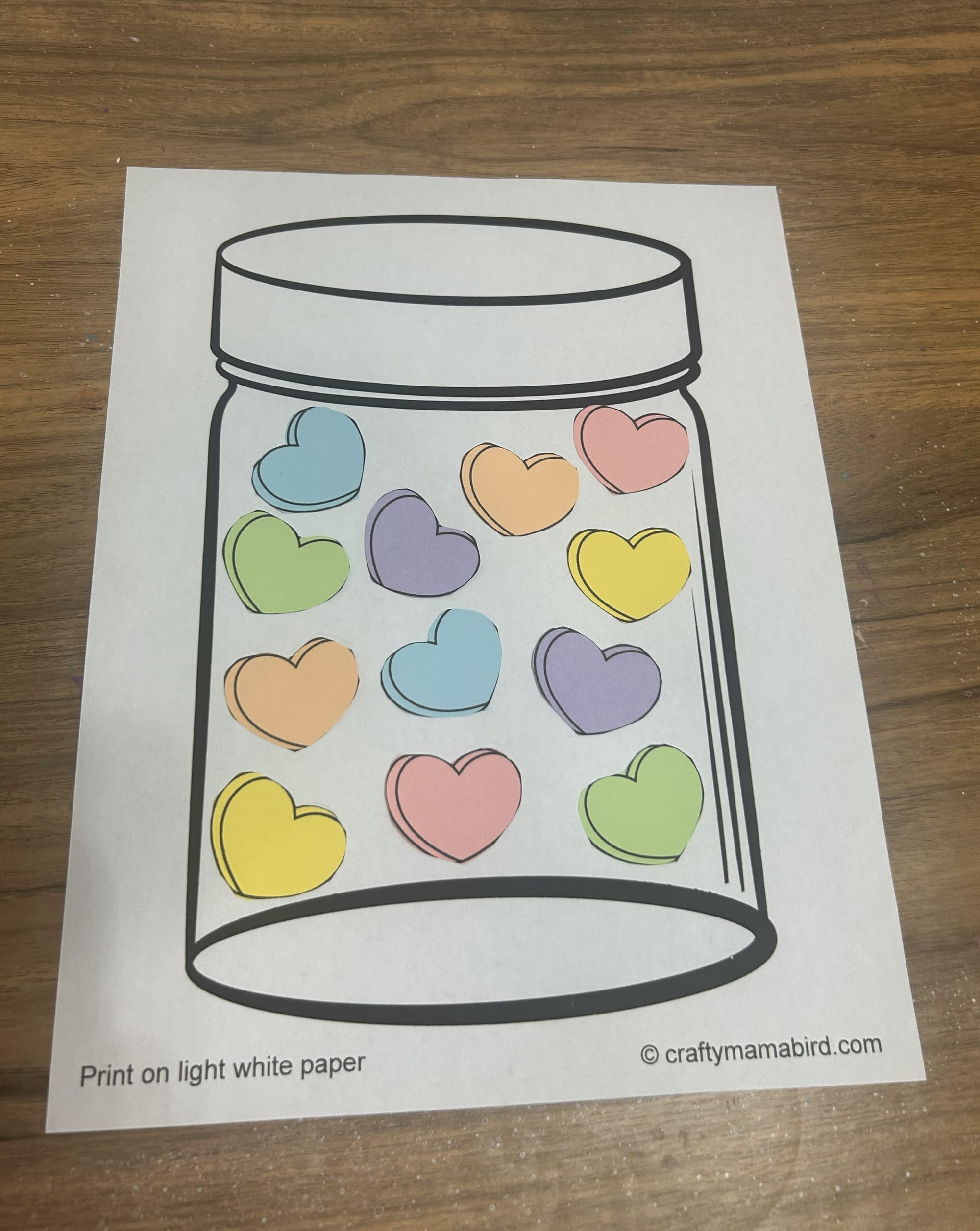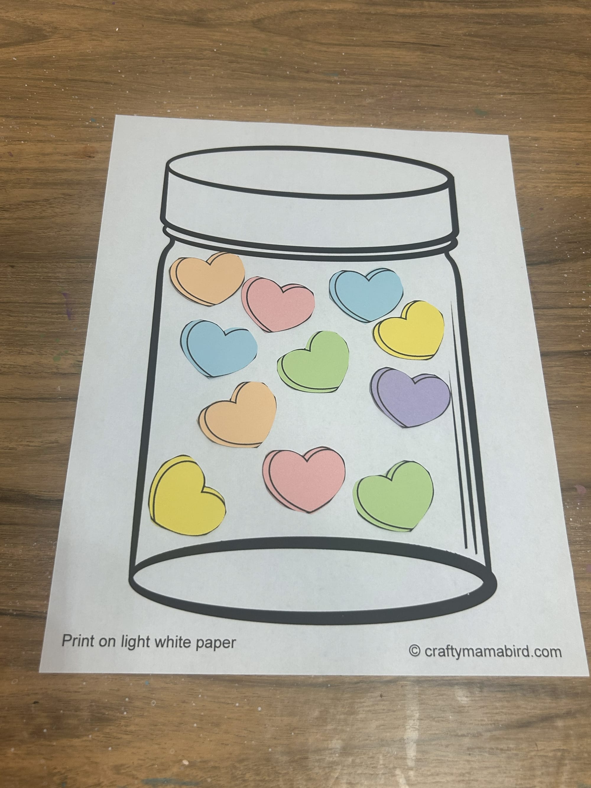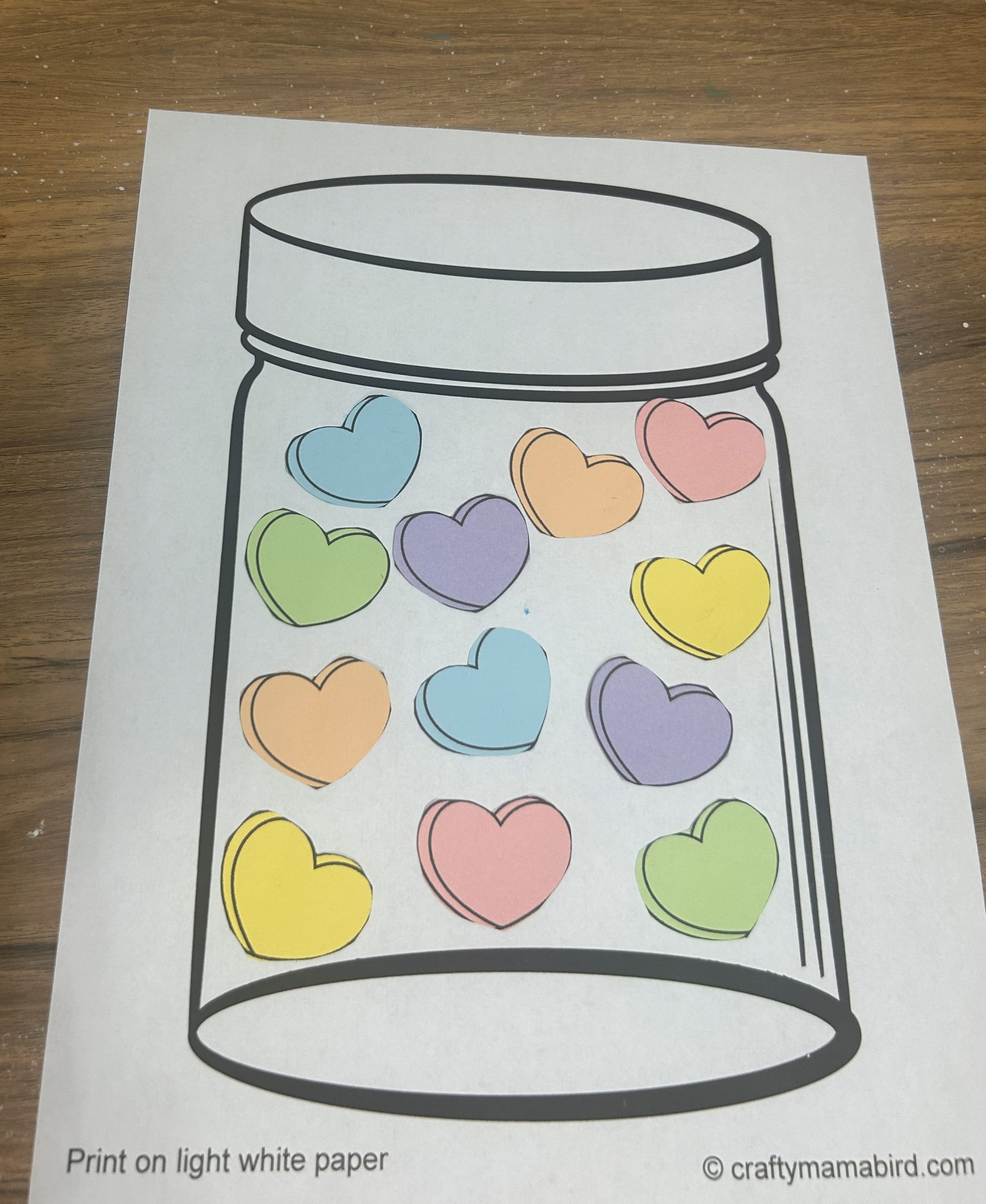 To begin print out the jar on white paper and the conversation hearts on a variety of color of your choice.