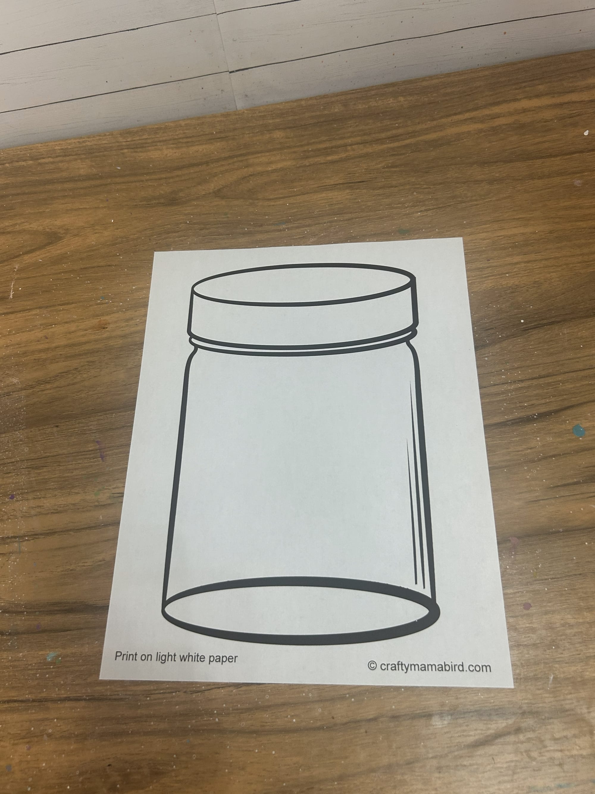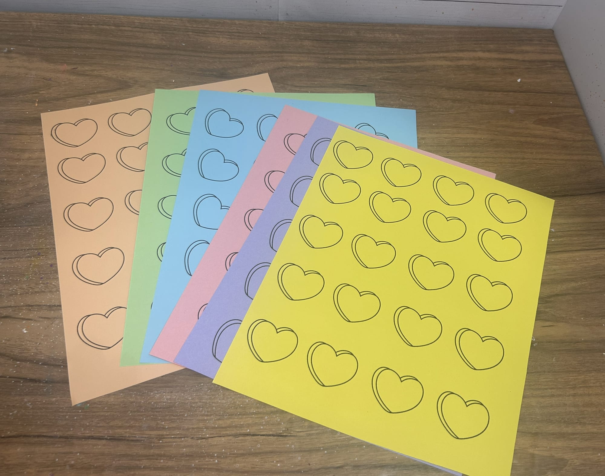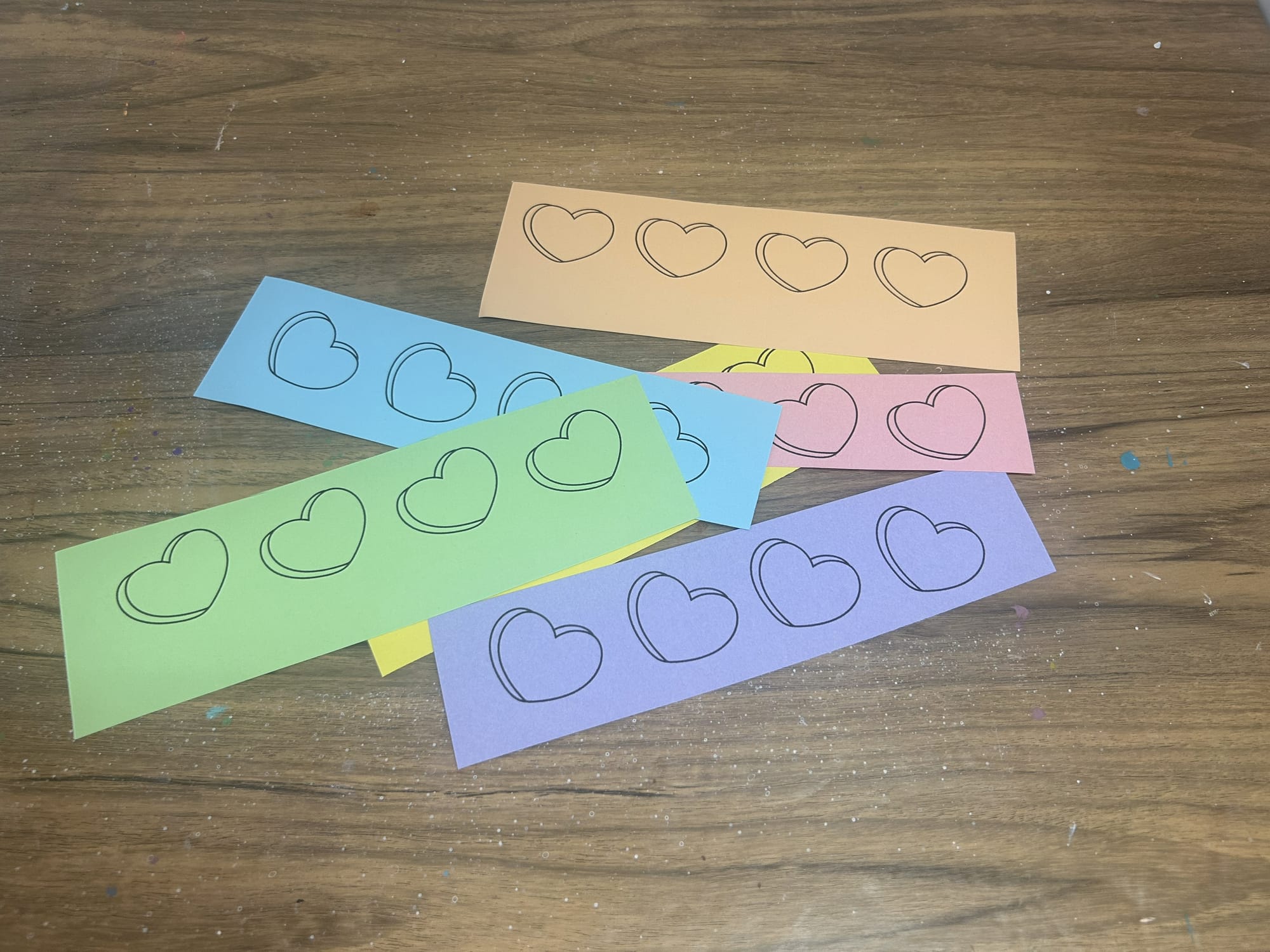 To begin print out the jar on white paper and the conversation hearts on a variety of color of your choice.