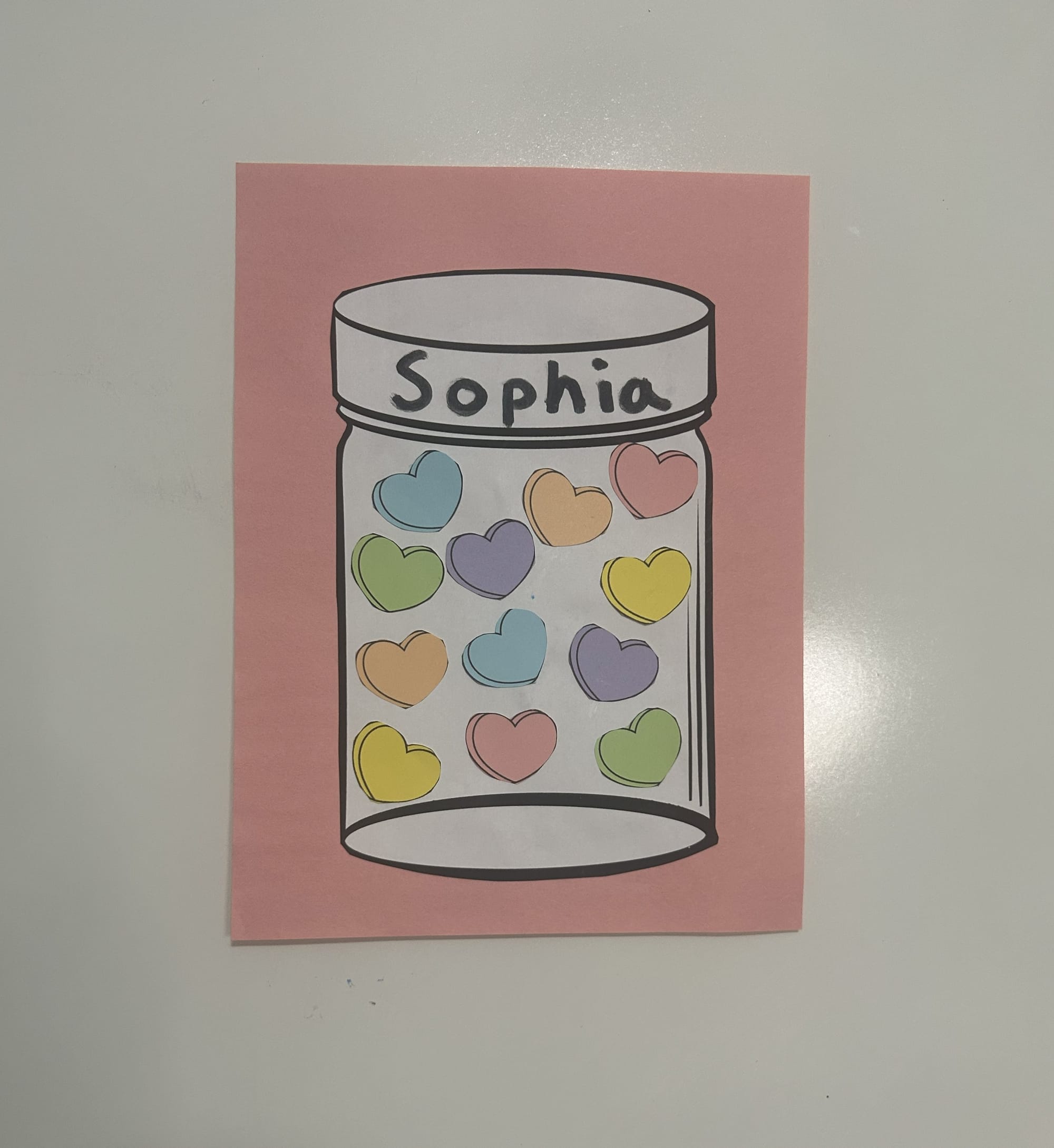 After, have your child select the color hearts they would like. Then, have them cut out the hearts . They can add as many hearts as they choose. Arrange the hearts inside the jar and glue them.