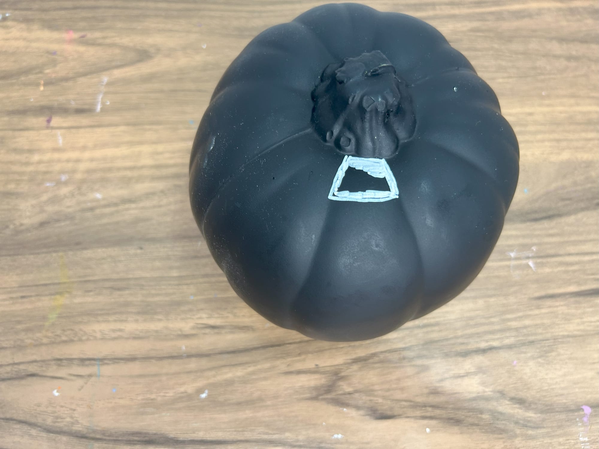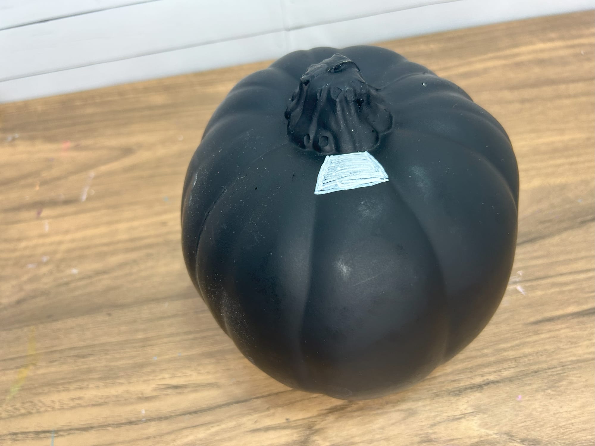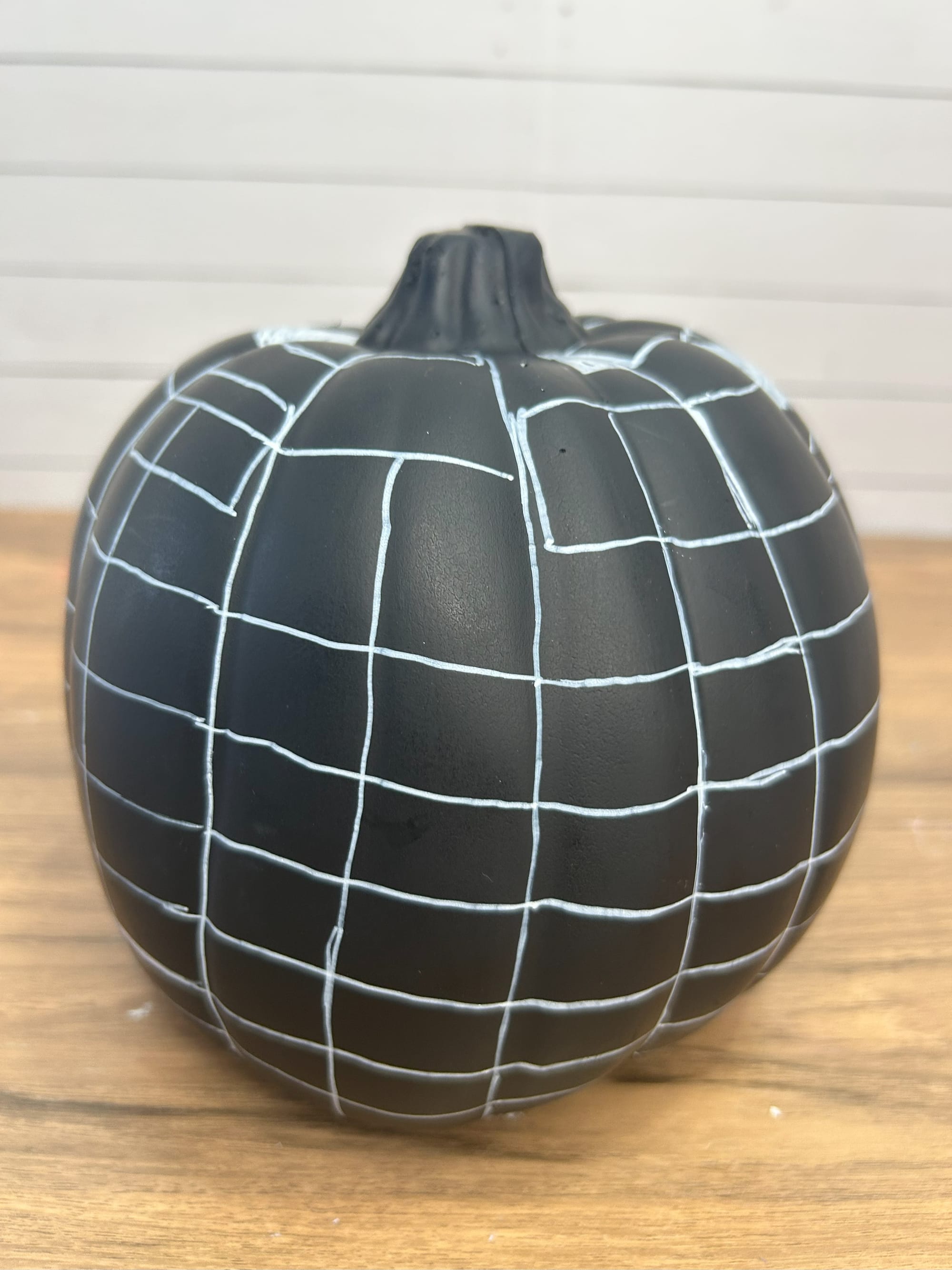 I began by creating a checkered pattern on the pumpkin. I used an acrylic paint pen to create my pattern. After, I painted the squares in a black or white pattern. You can use paint pens or acrylic paint. You can however, use any colors you like.