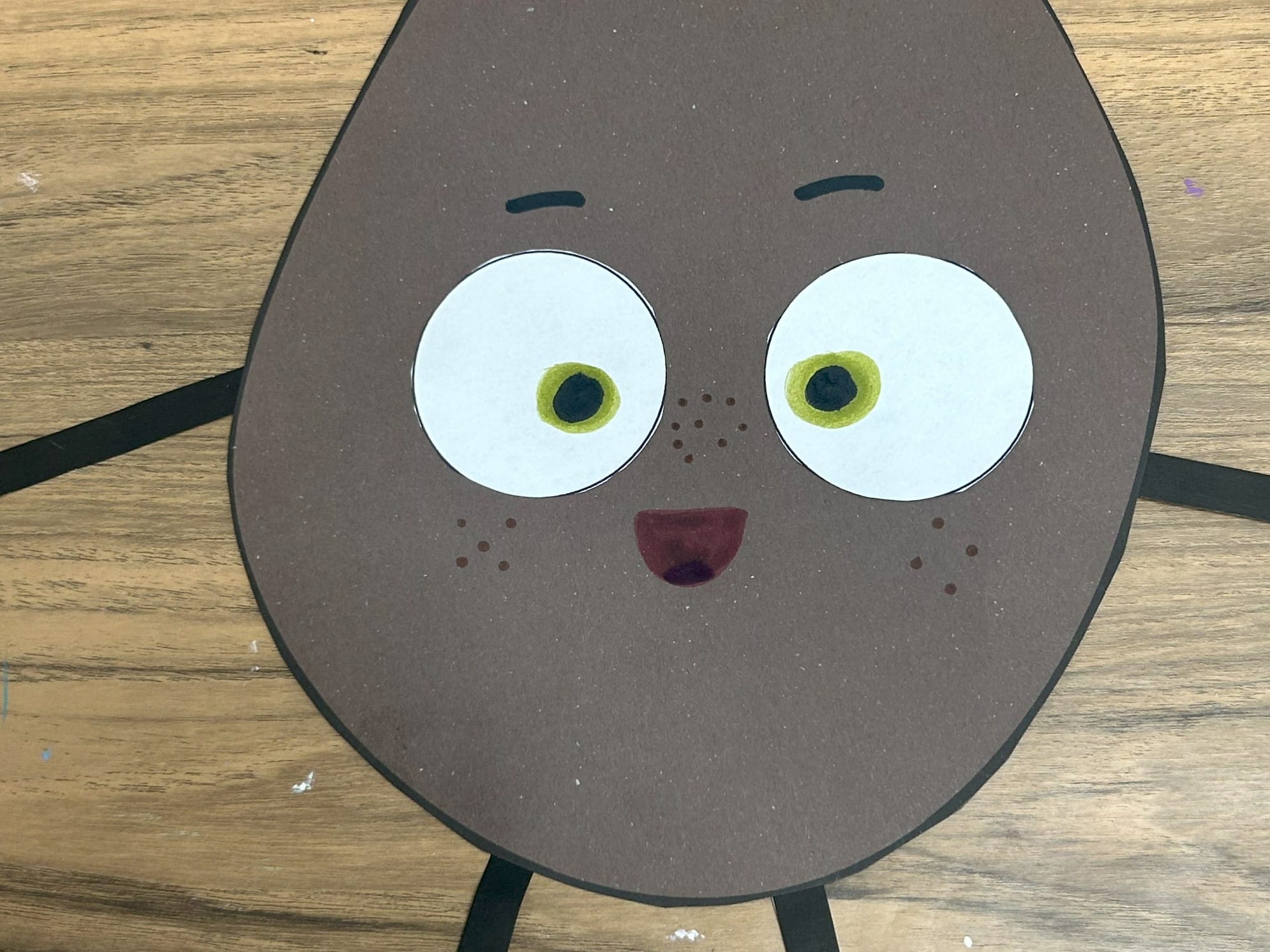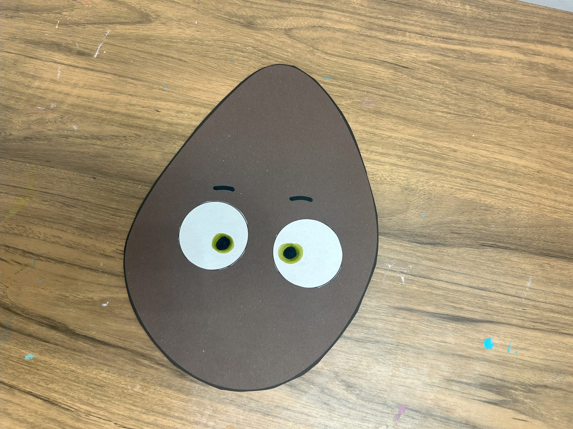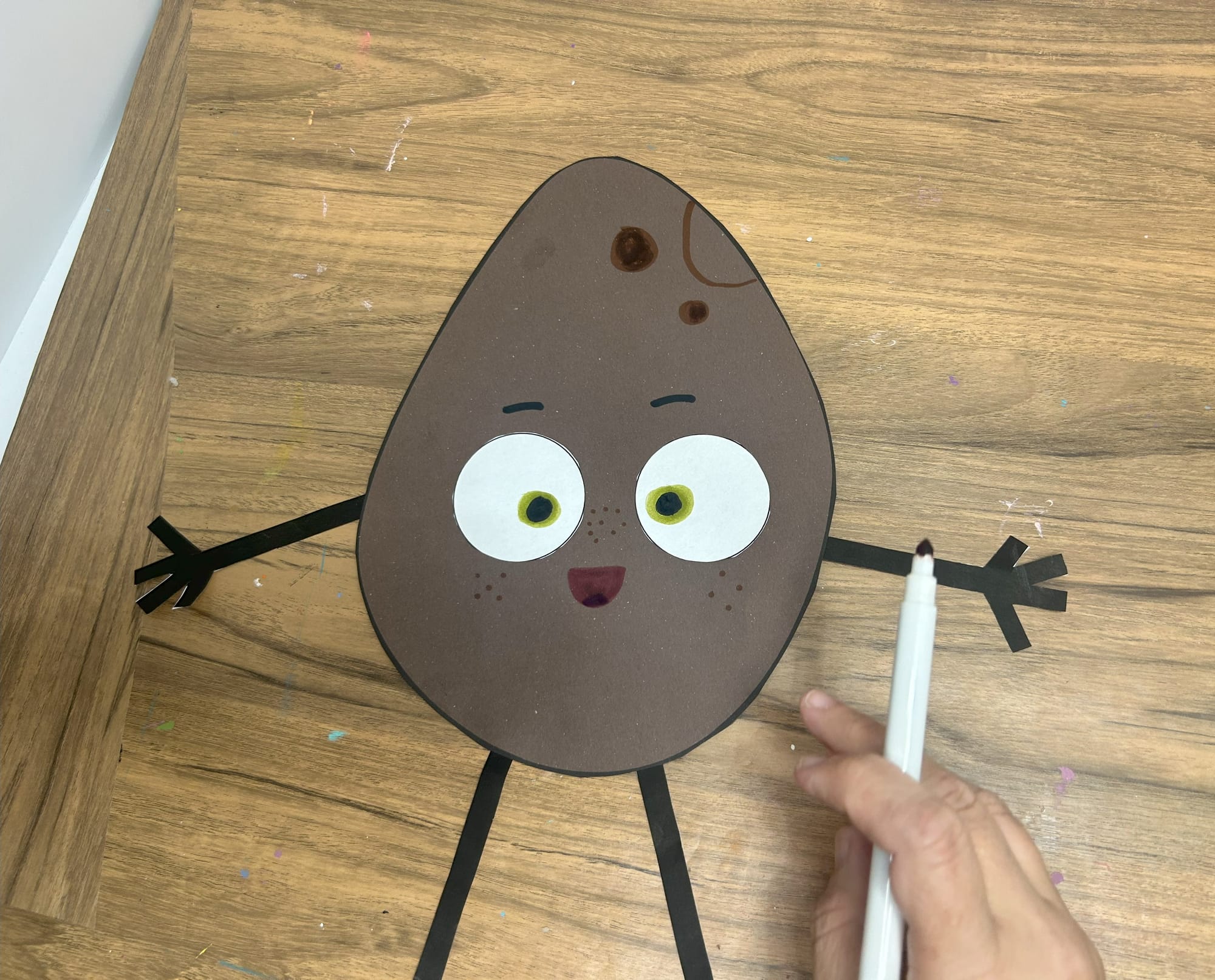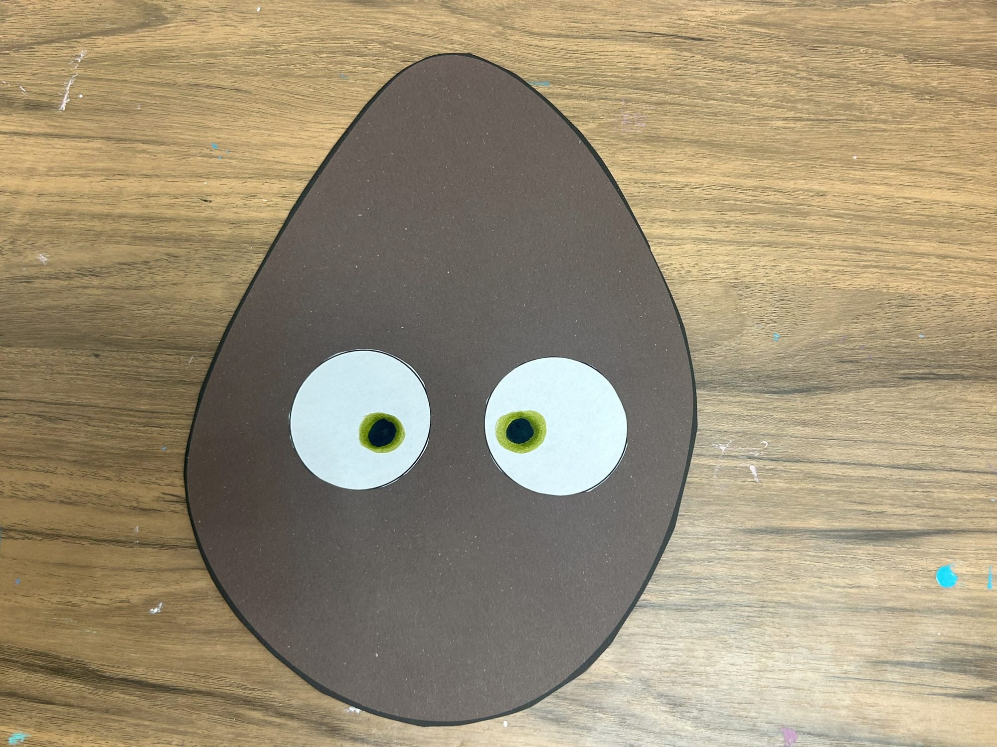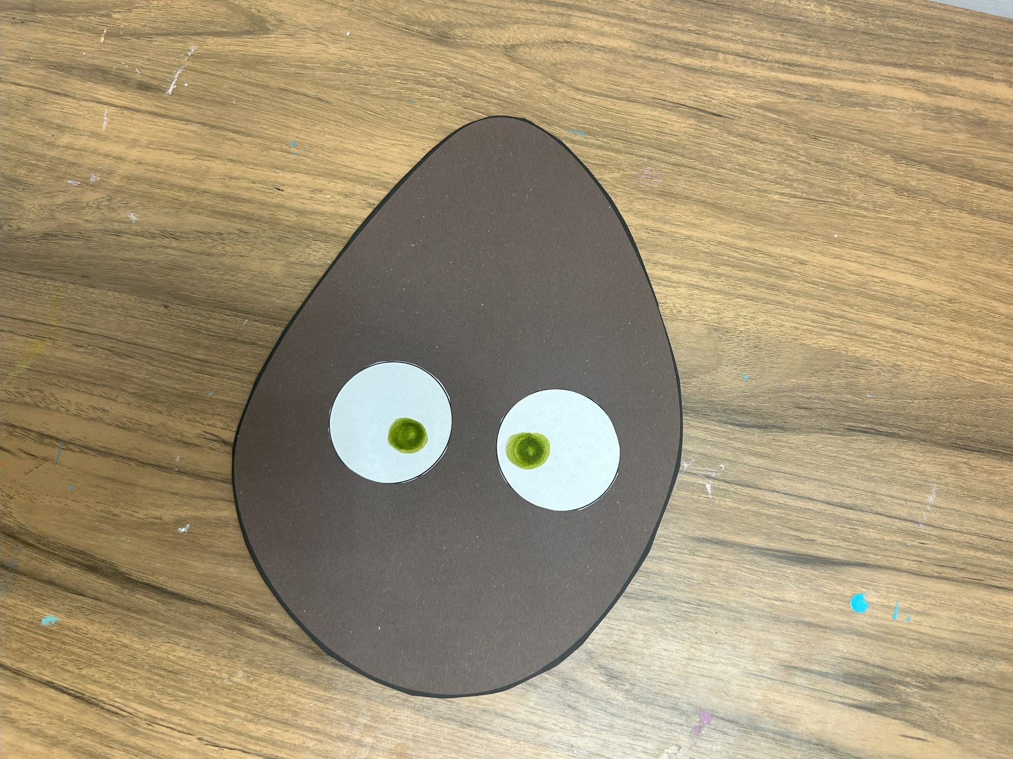 Glue the white circles onto the potato shape. Using a green marker add pupils and then add black circles on top of the green ones.