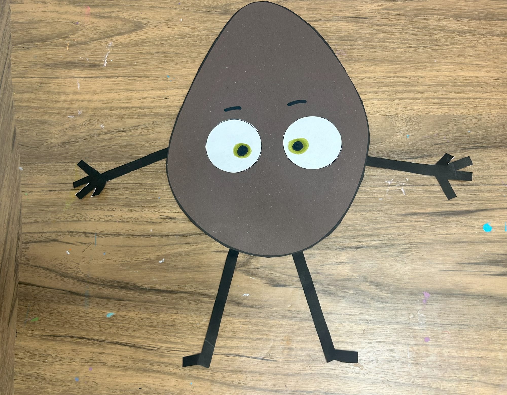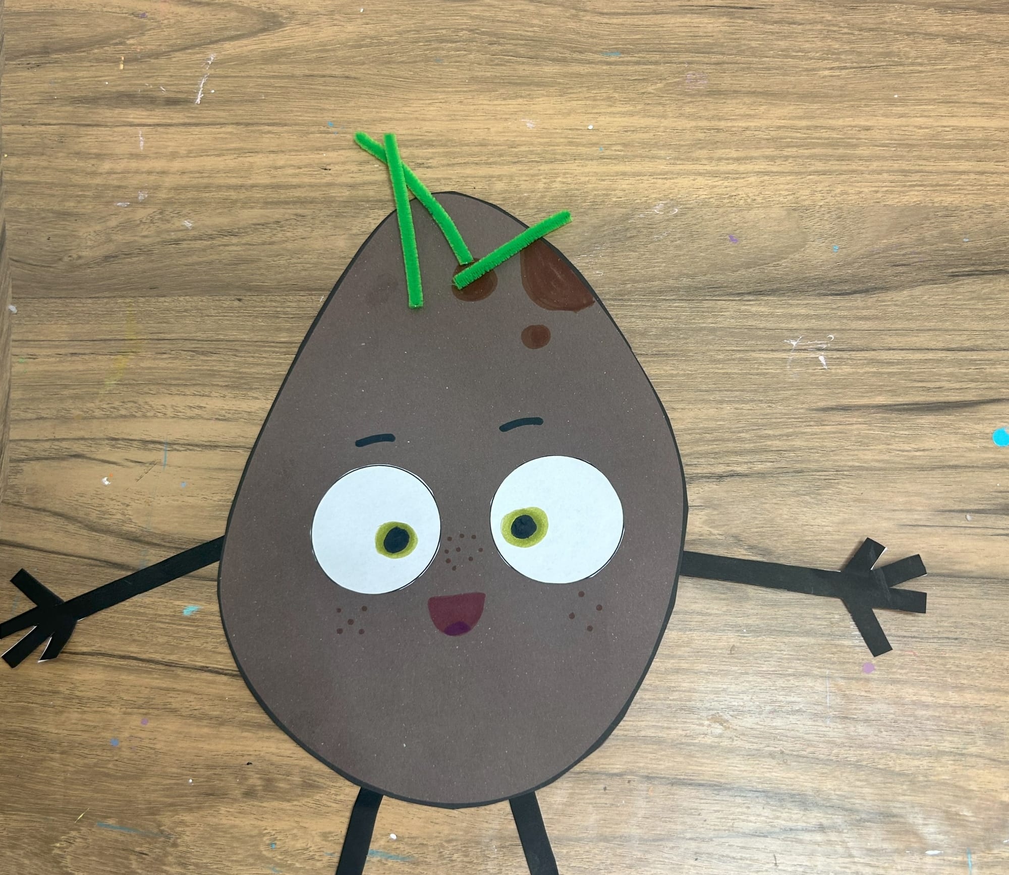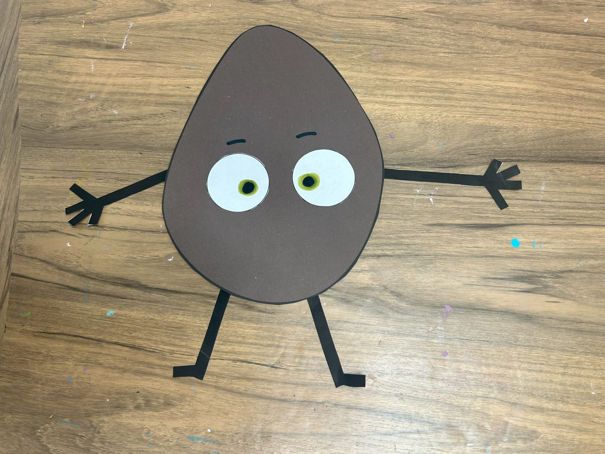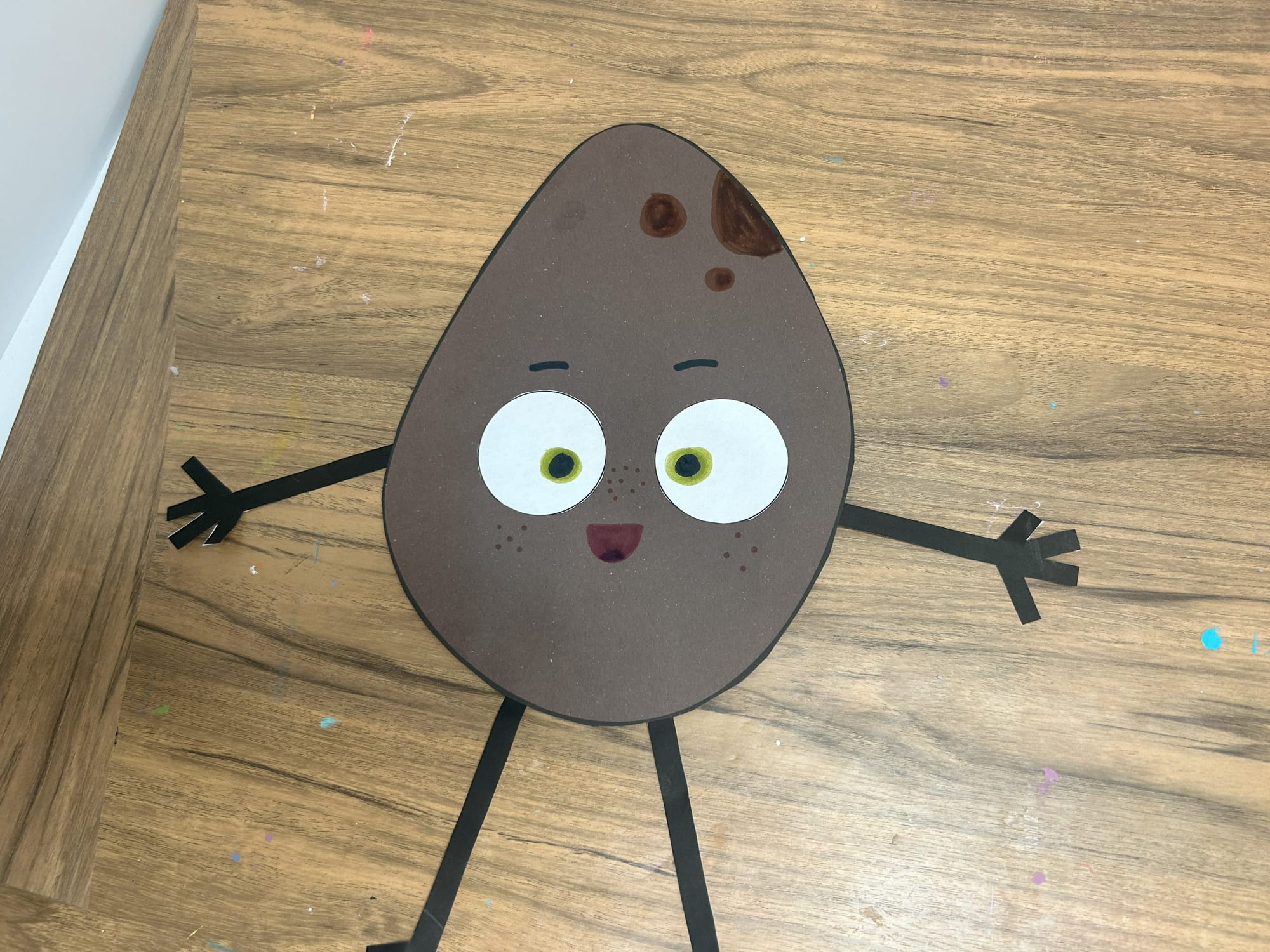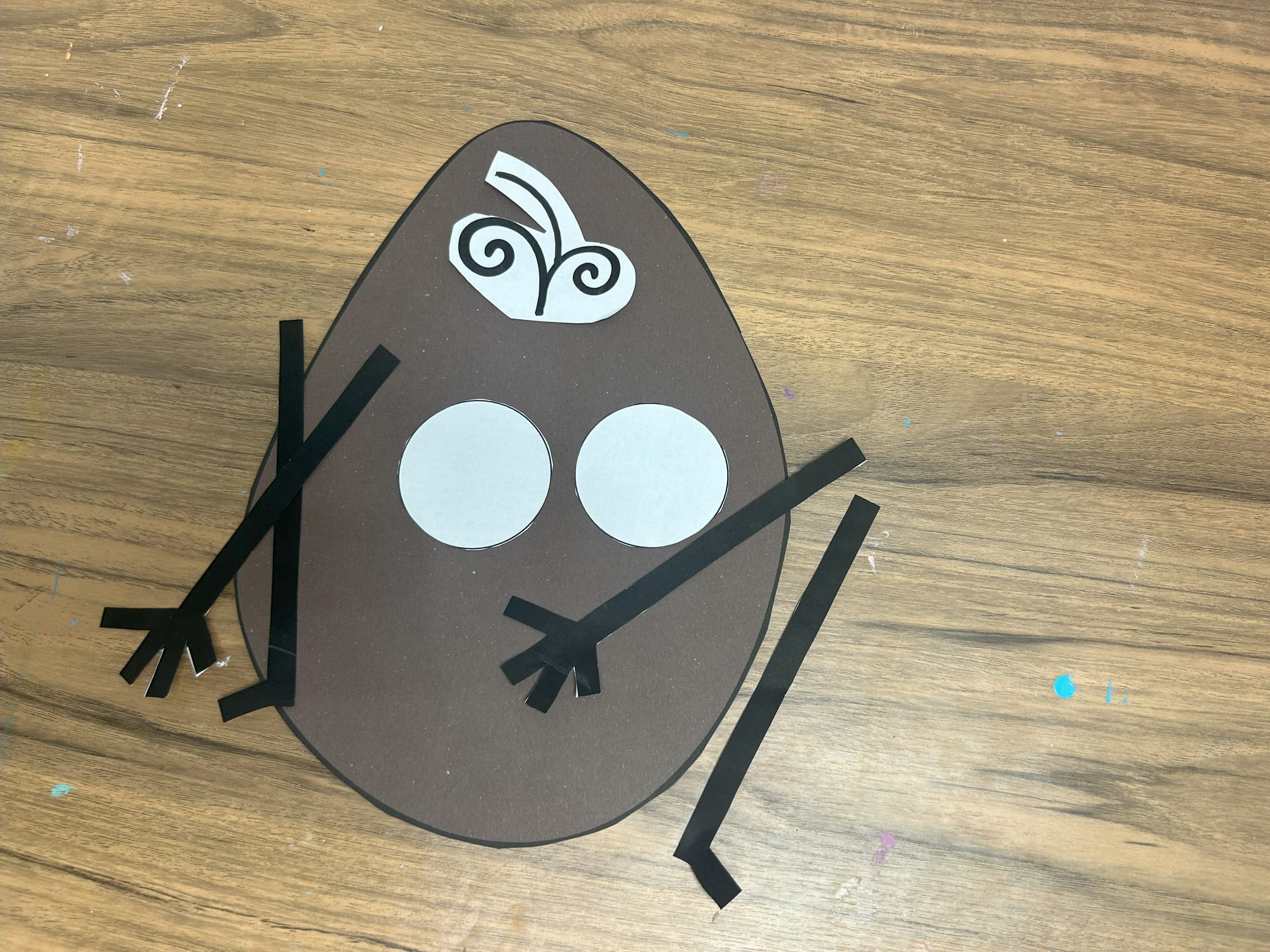 Glue the white circles onto the potato shape. Using a green marker add pupils and then add black circles on top of the green ones.