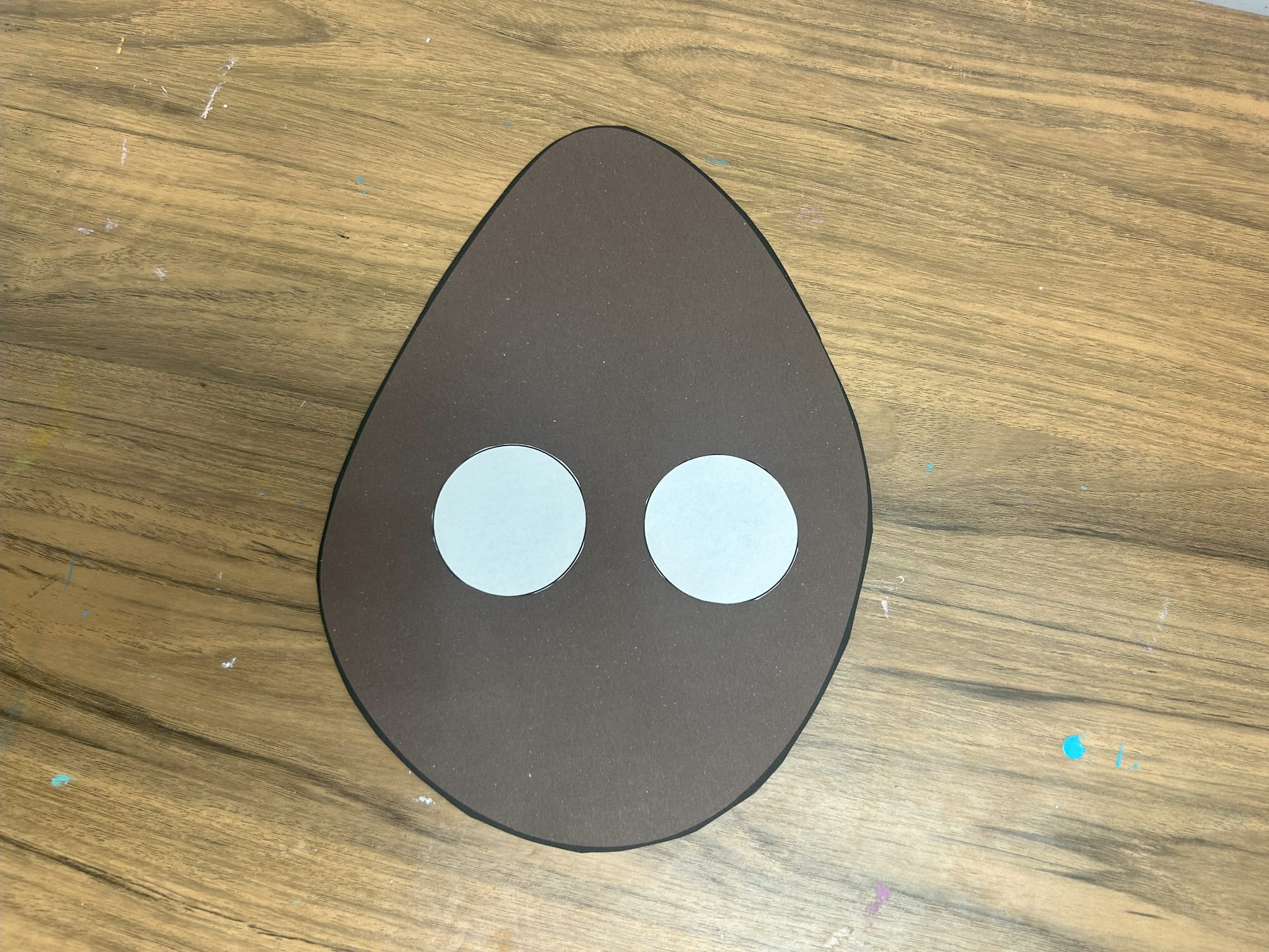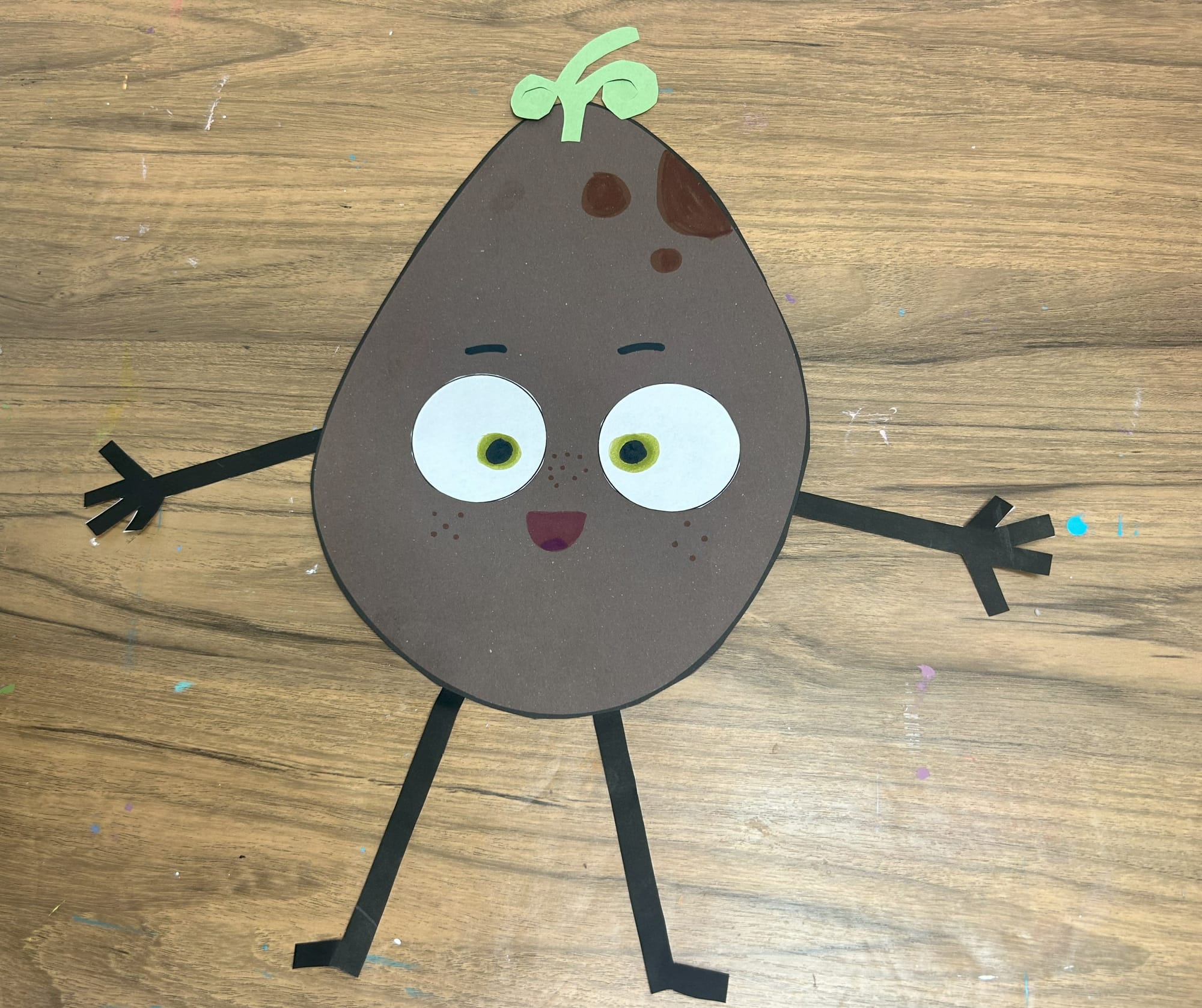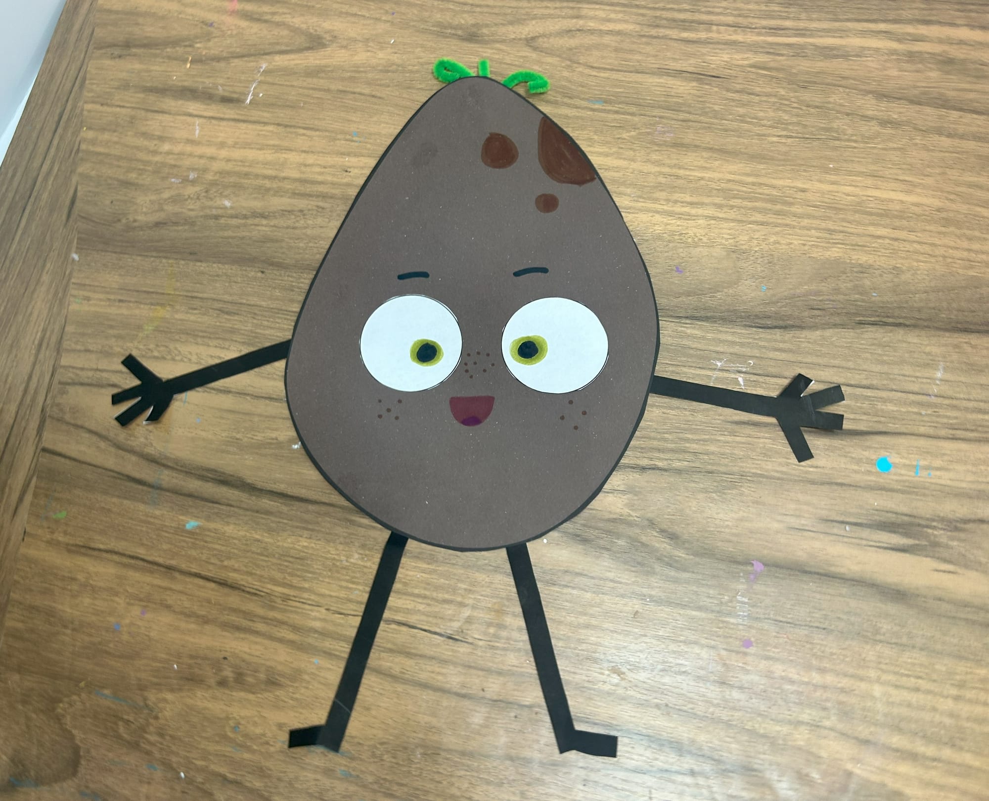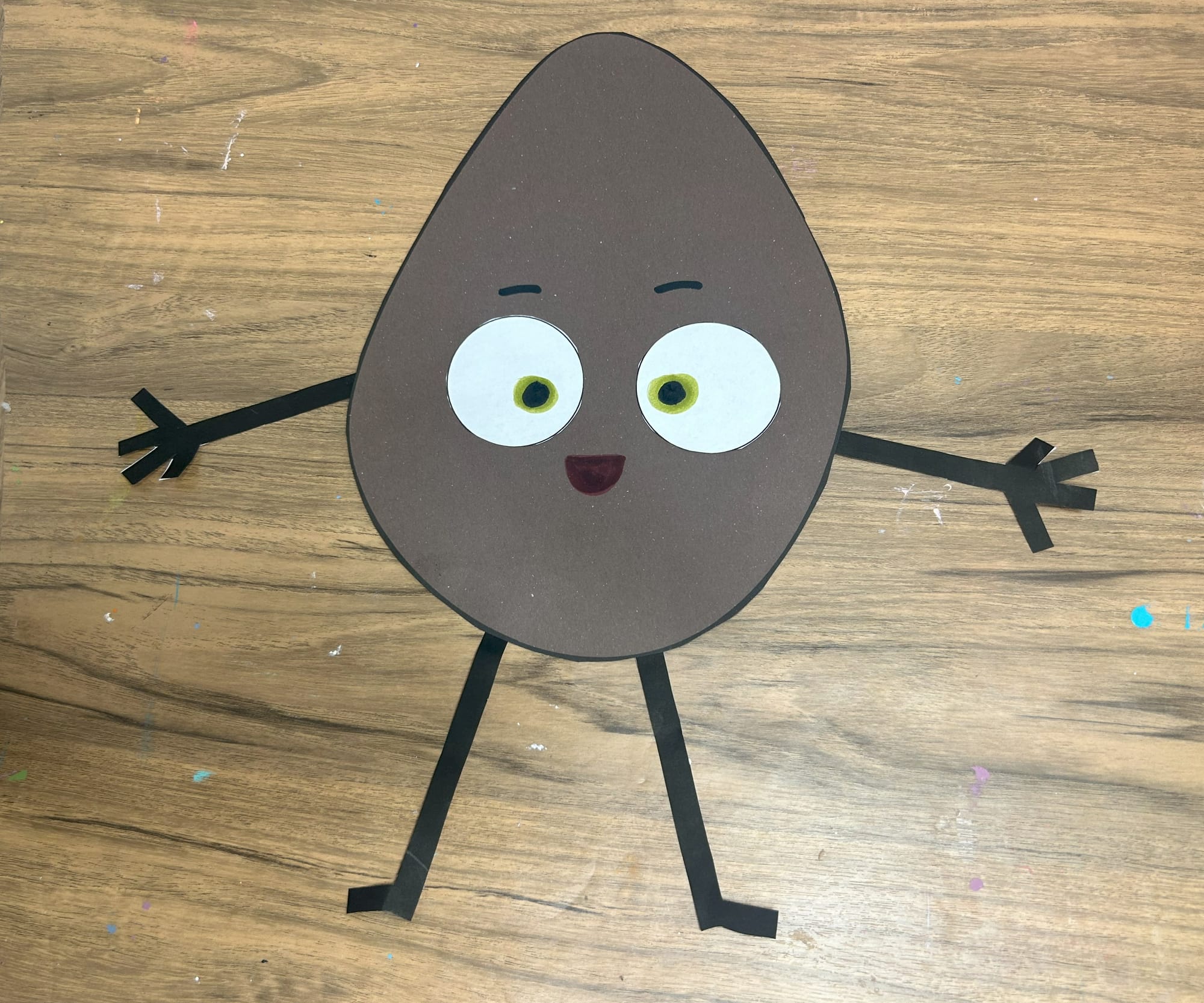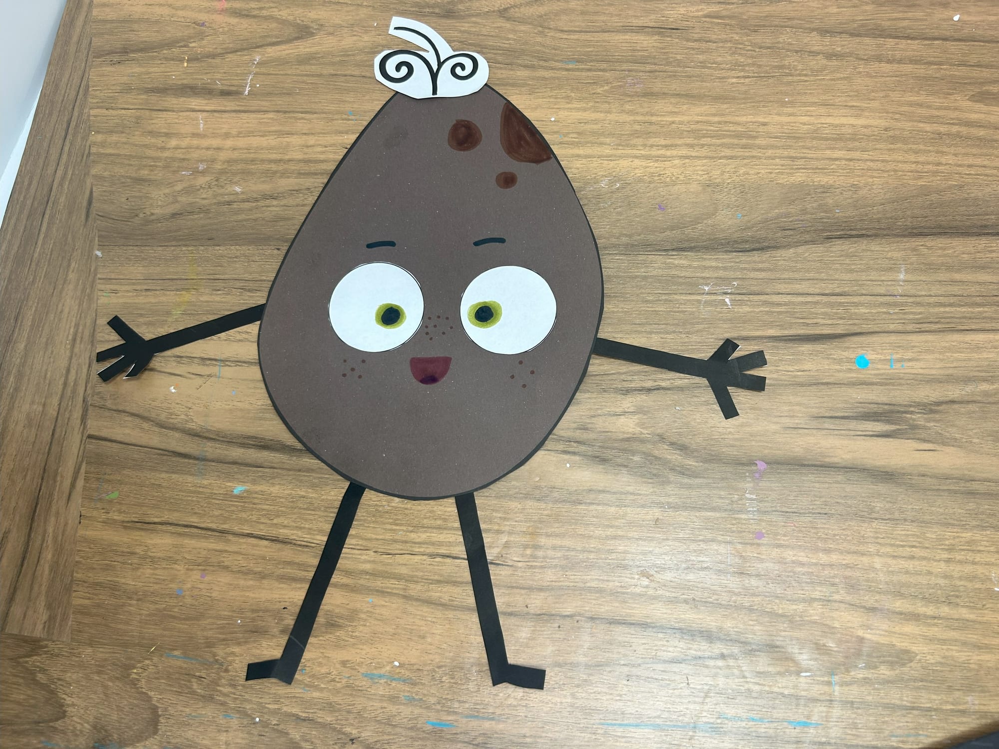 Glue the white circles onto the potato shape. Using a green marker add pupils and then add black circles on top of the green ones.