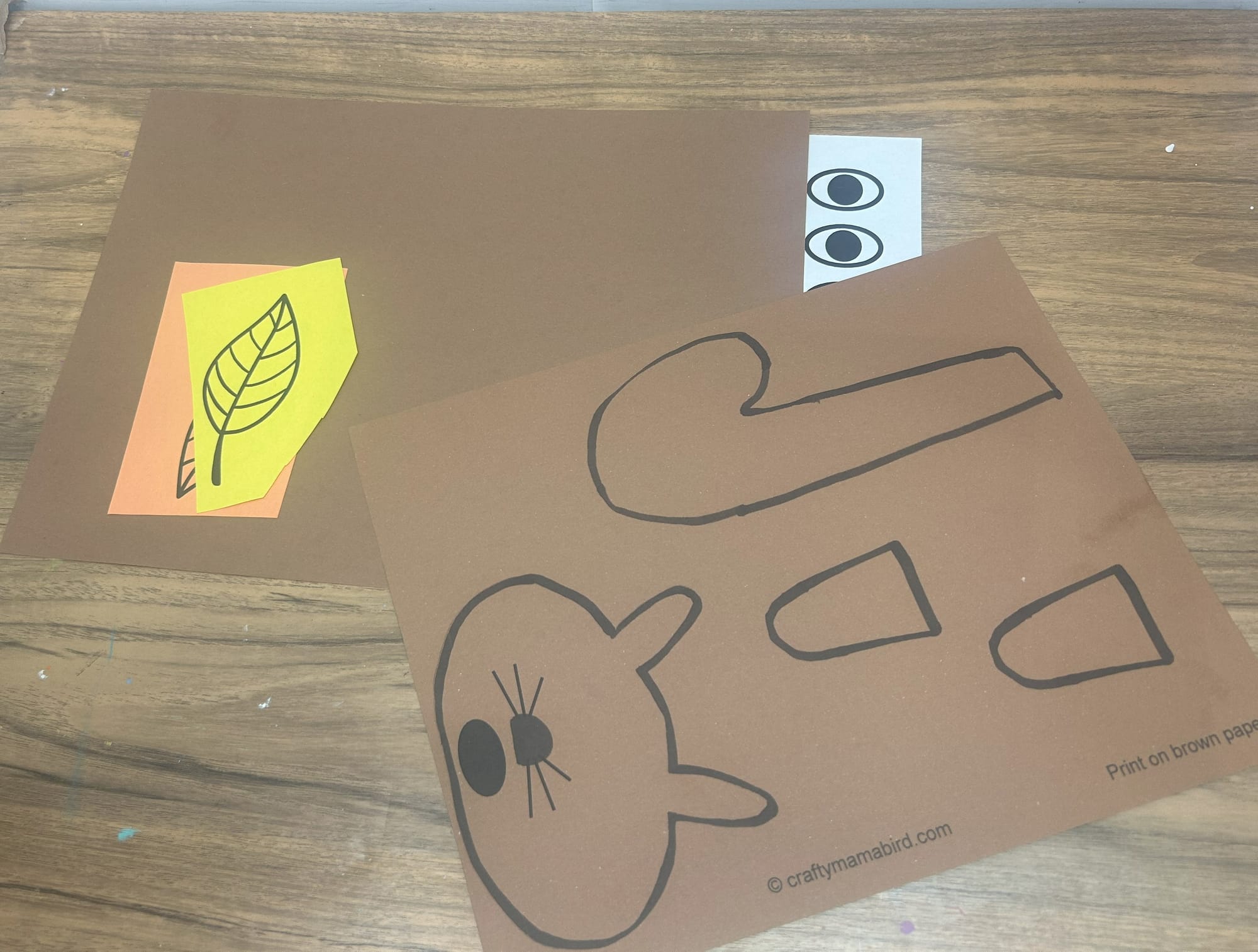To make squirrel begin by printing out the pieces or tracing them onto construction paper.