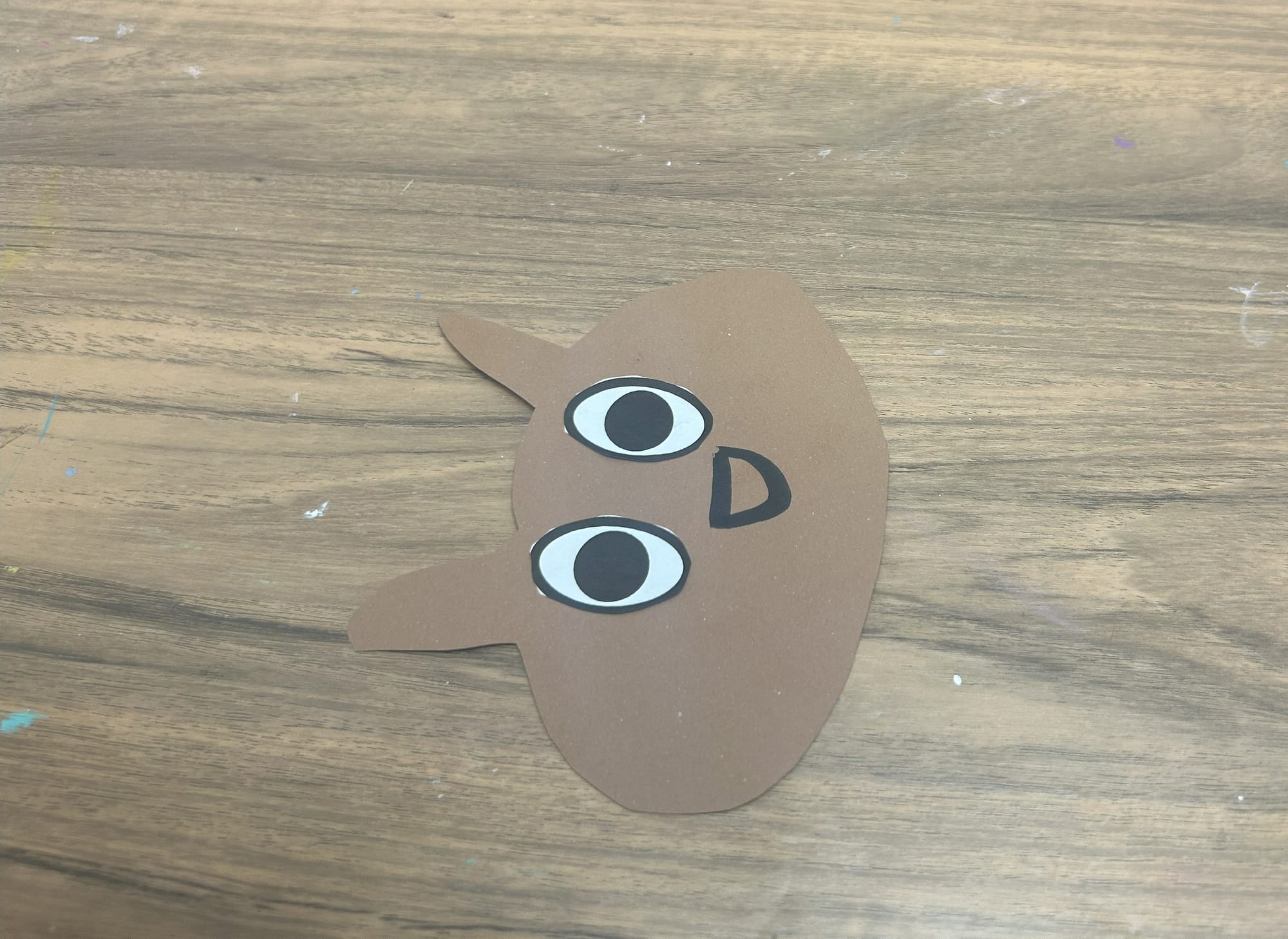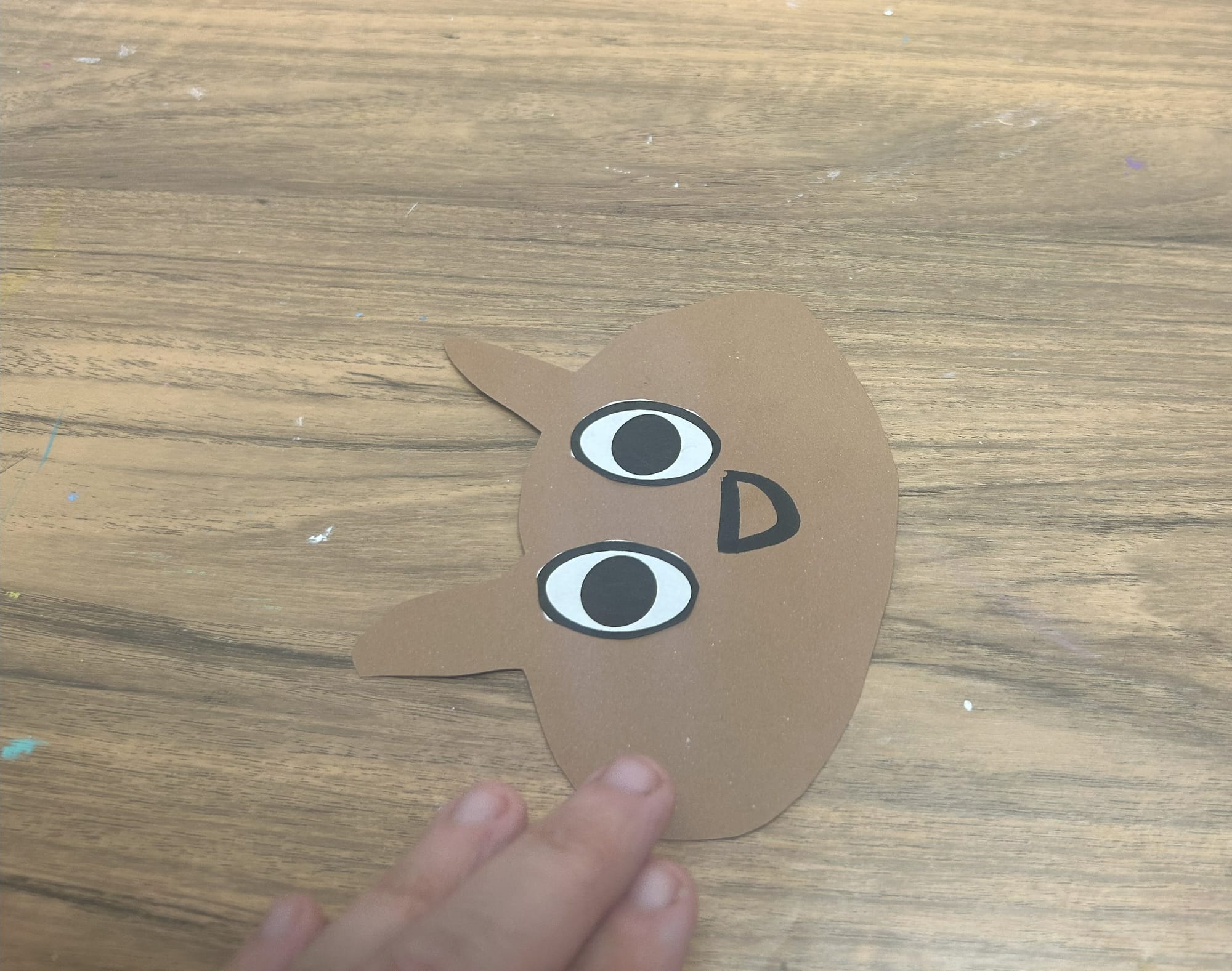 To make the face, you can use a pre drawn face or create your own. To make the face, first glue the eyes to the face. After, turn the paper sideways and draw a capital D to make the nose. Color in the capital D and add lines on the side for whiskers. Finally, add a mouth by drawing and coloring in an oval shape.