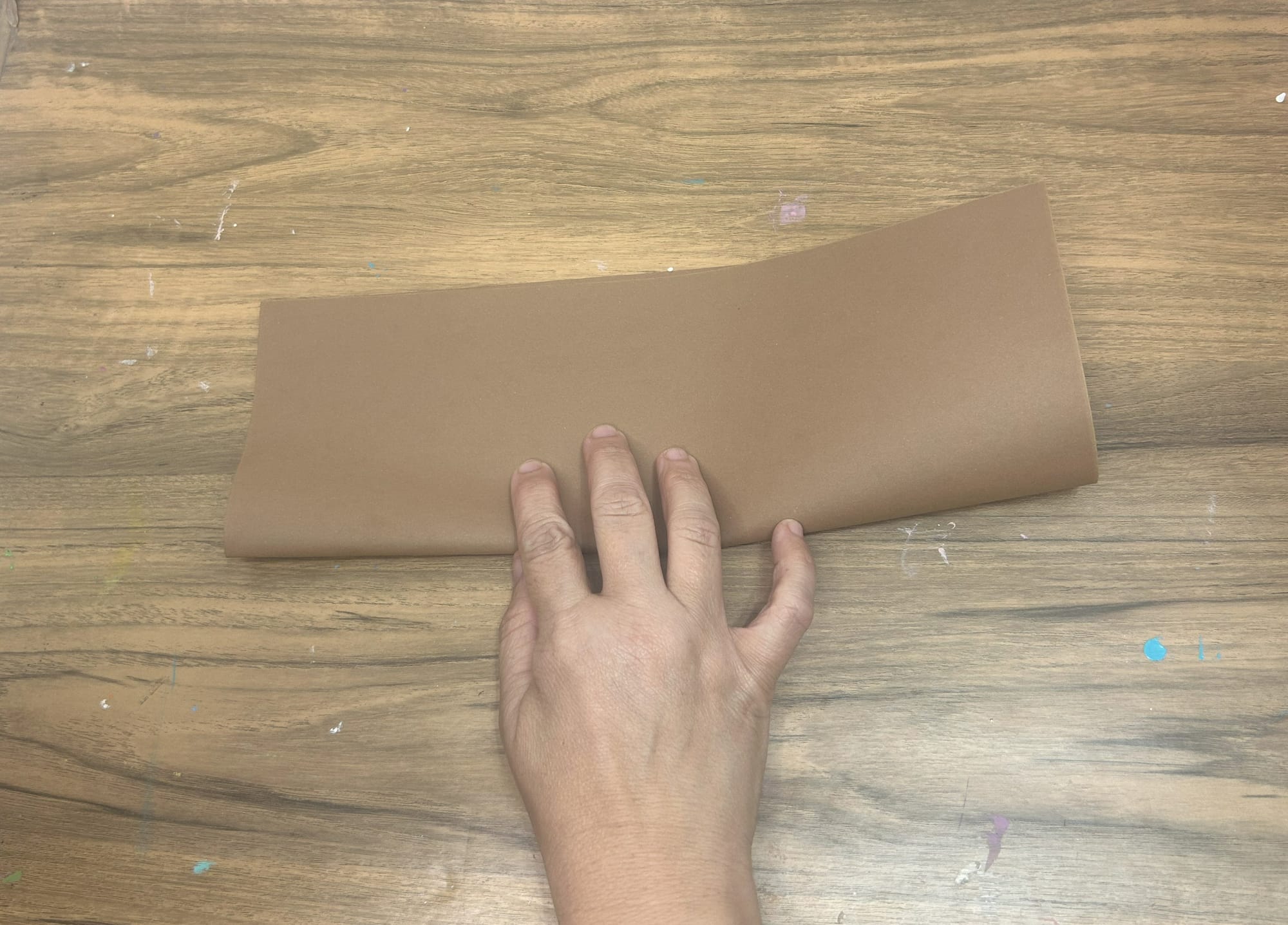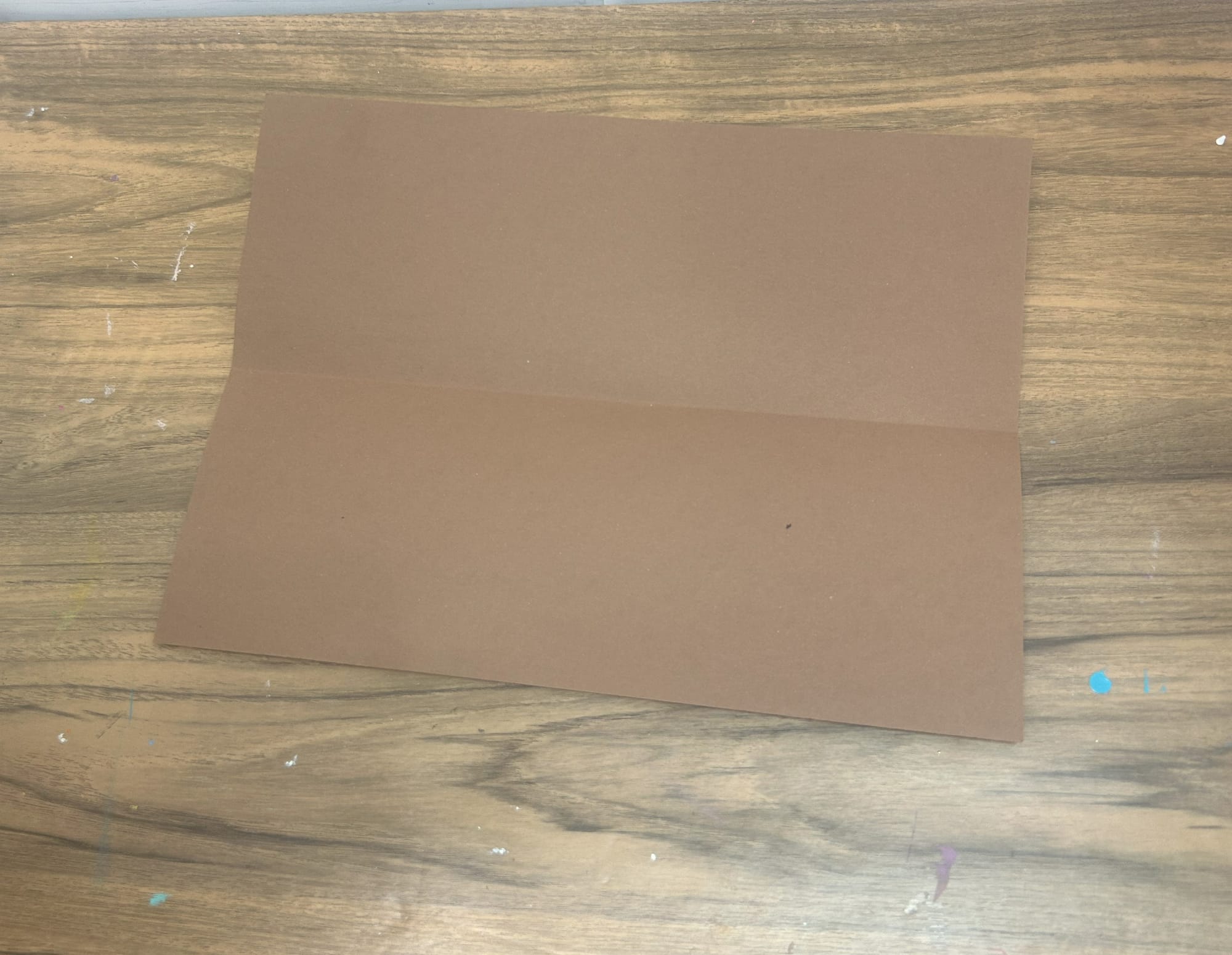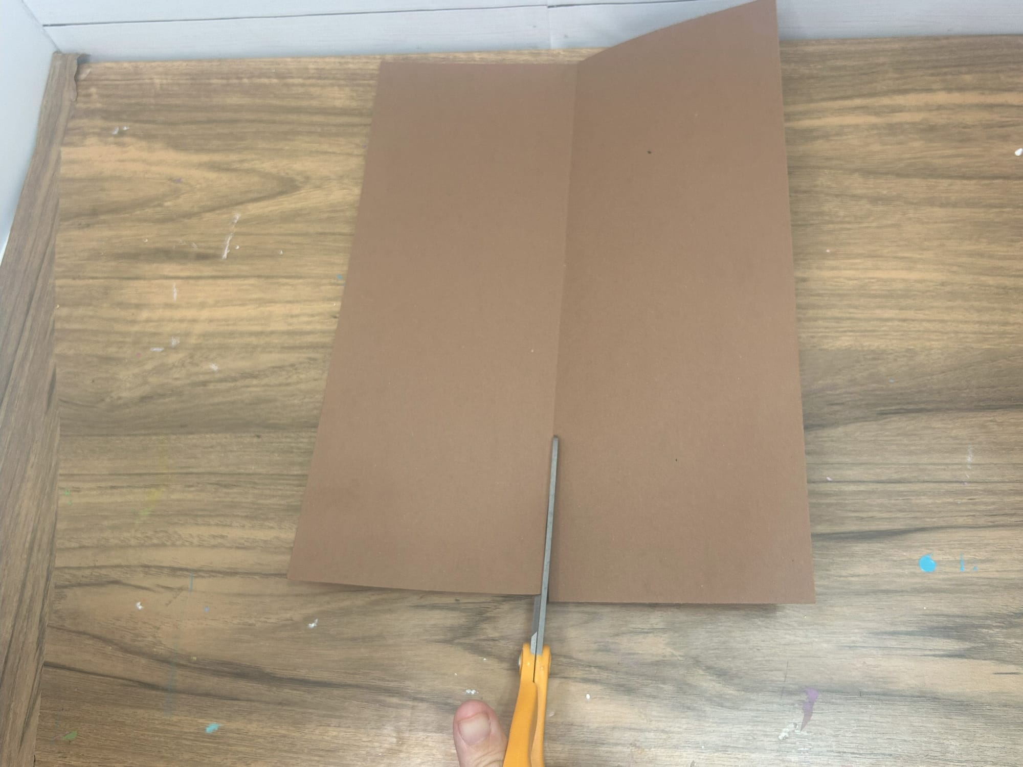 Next, you will need a piece of brown construction paper. Fold the paper in half lengthwise, a hot dog fold. Then, cut on the fold to create 2 pieces.