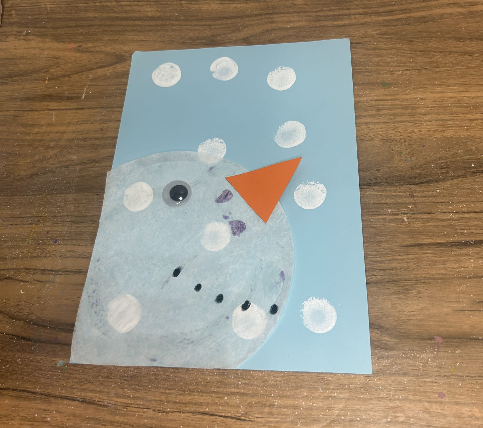 So easy to do, provide your child with a pencil. Use the end of the eraser dipped into paint and add dots to the paper. This will create a snow background on the paper.
