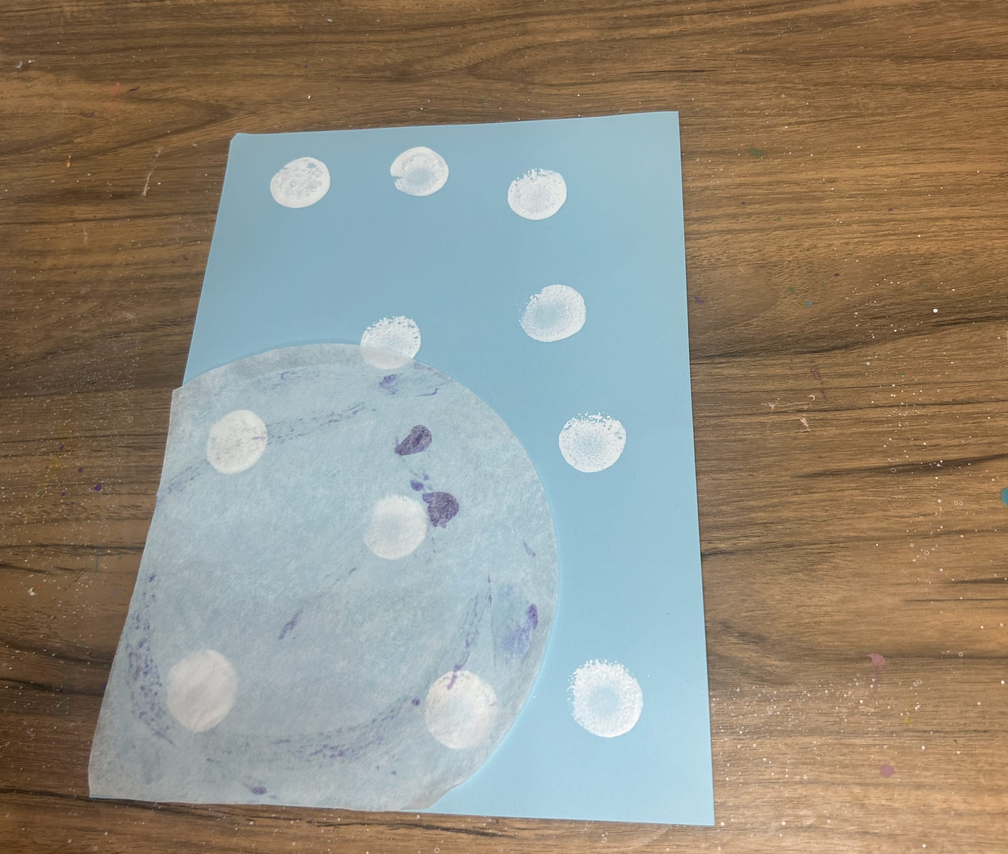 To create this background, add some water to some white paint. Then dip an old paintbrush in the watered down paint. Use your finger to flick the white paint onto the paper. It is okay if you get some bigger drips on your paper.