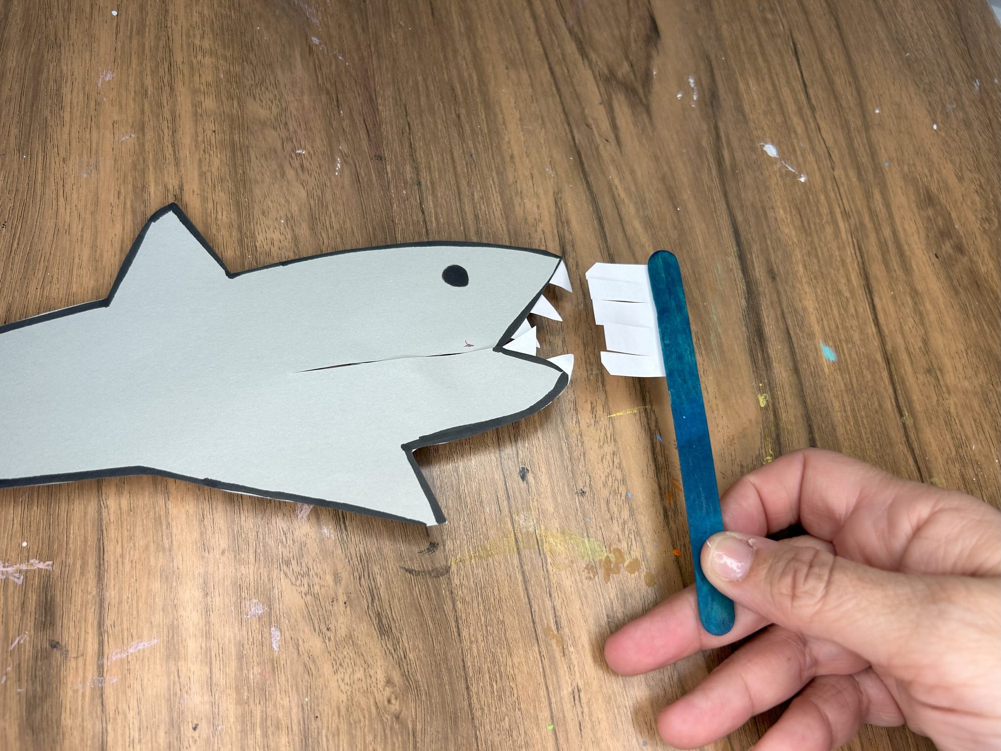 Now it is time to create a toothbrush for your shark. You can make the toothbrush using a popsicle stick and white paper or foam. Glue on a rectangle shape of paper or foam using hot glue. Once it is attached, use scissors to cut slits going up to make the toothbrush bristles. Have your child practice brushing the shark's teeth to remind them of the daily routine.