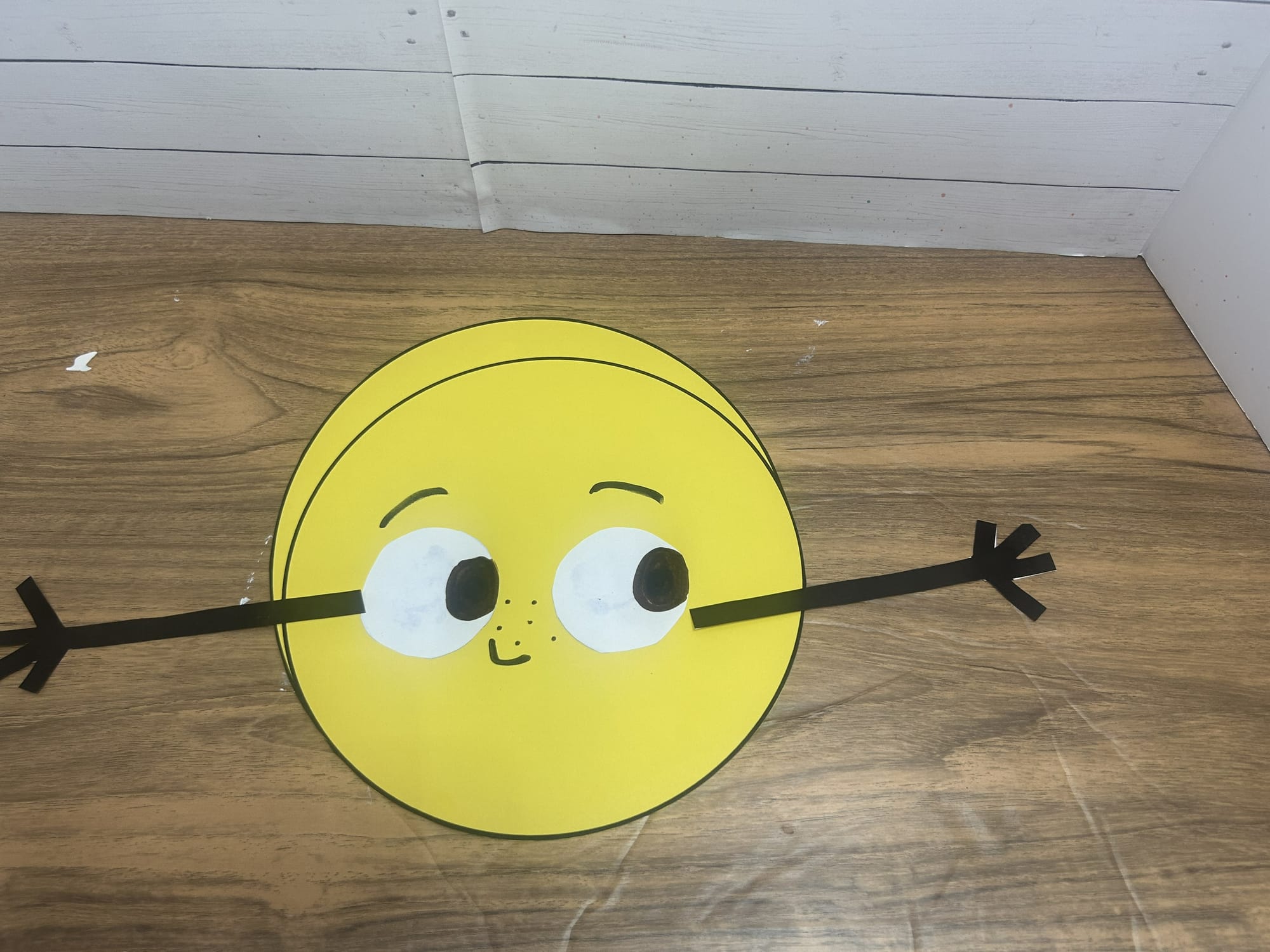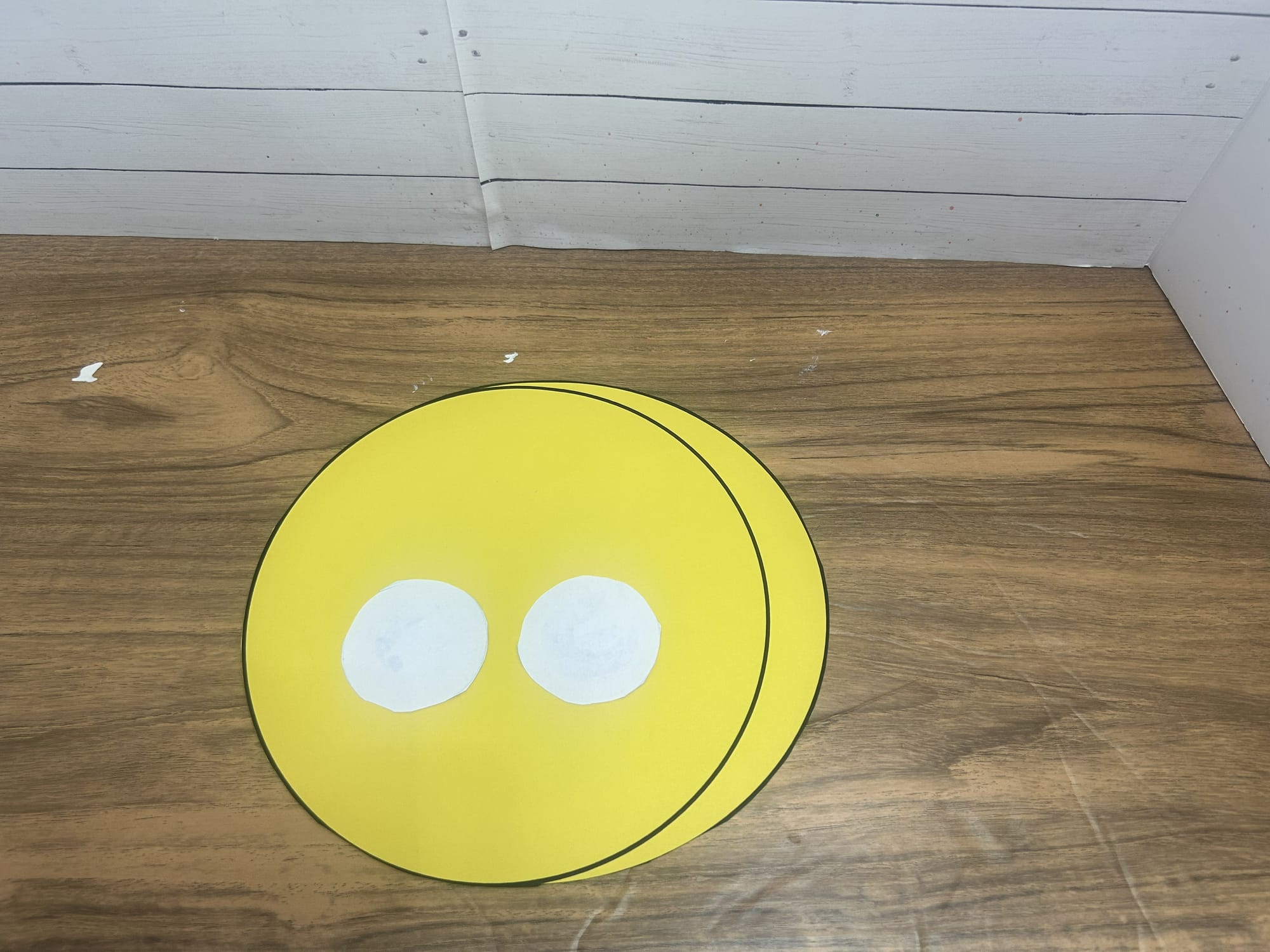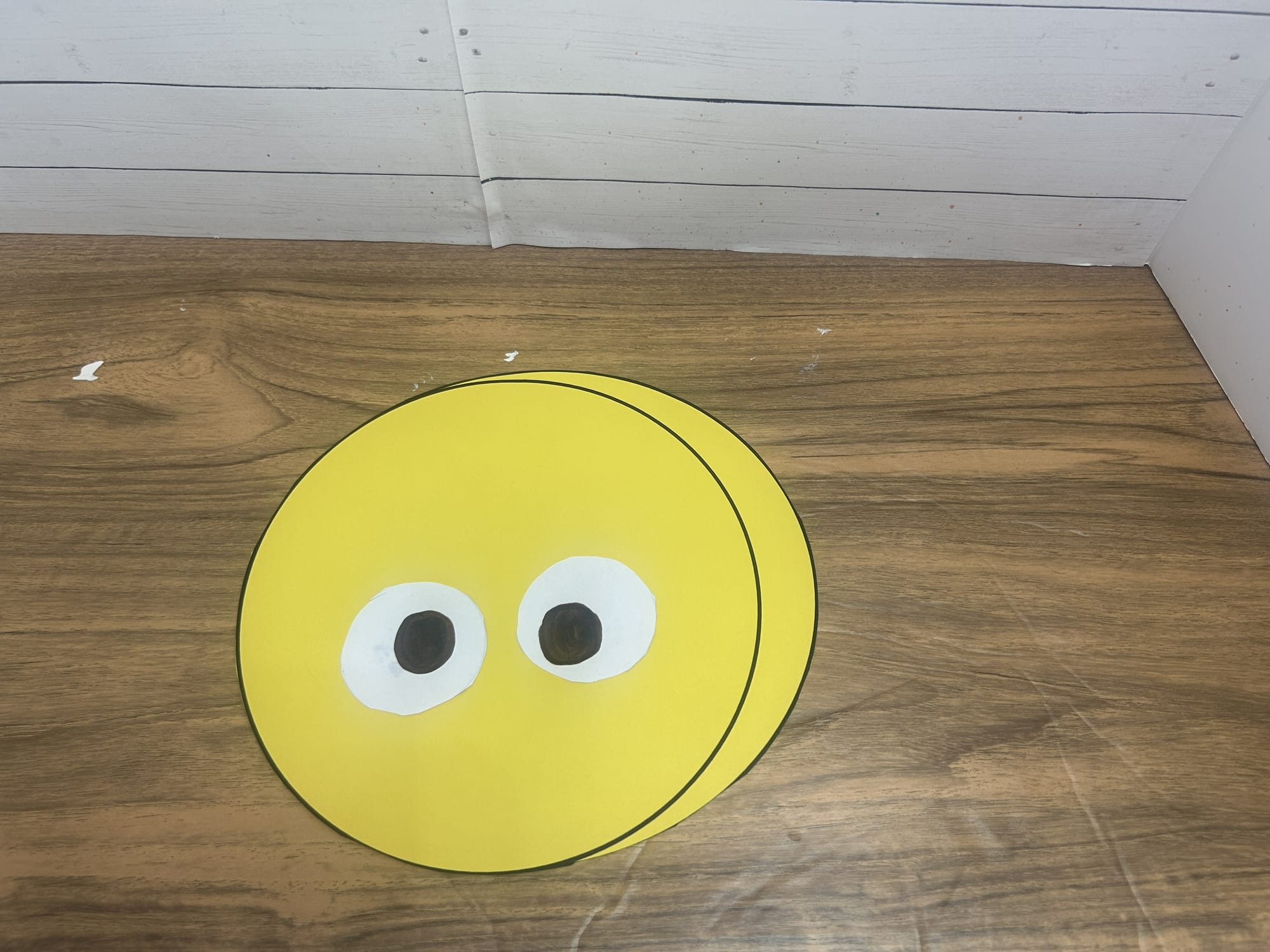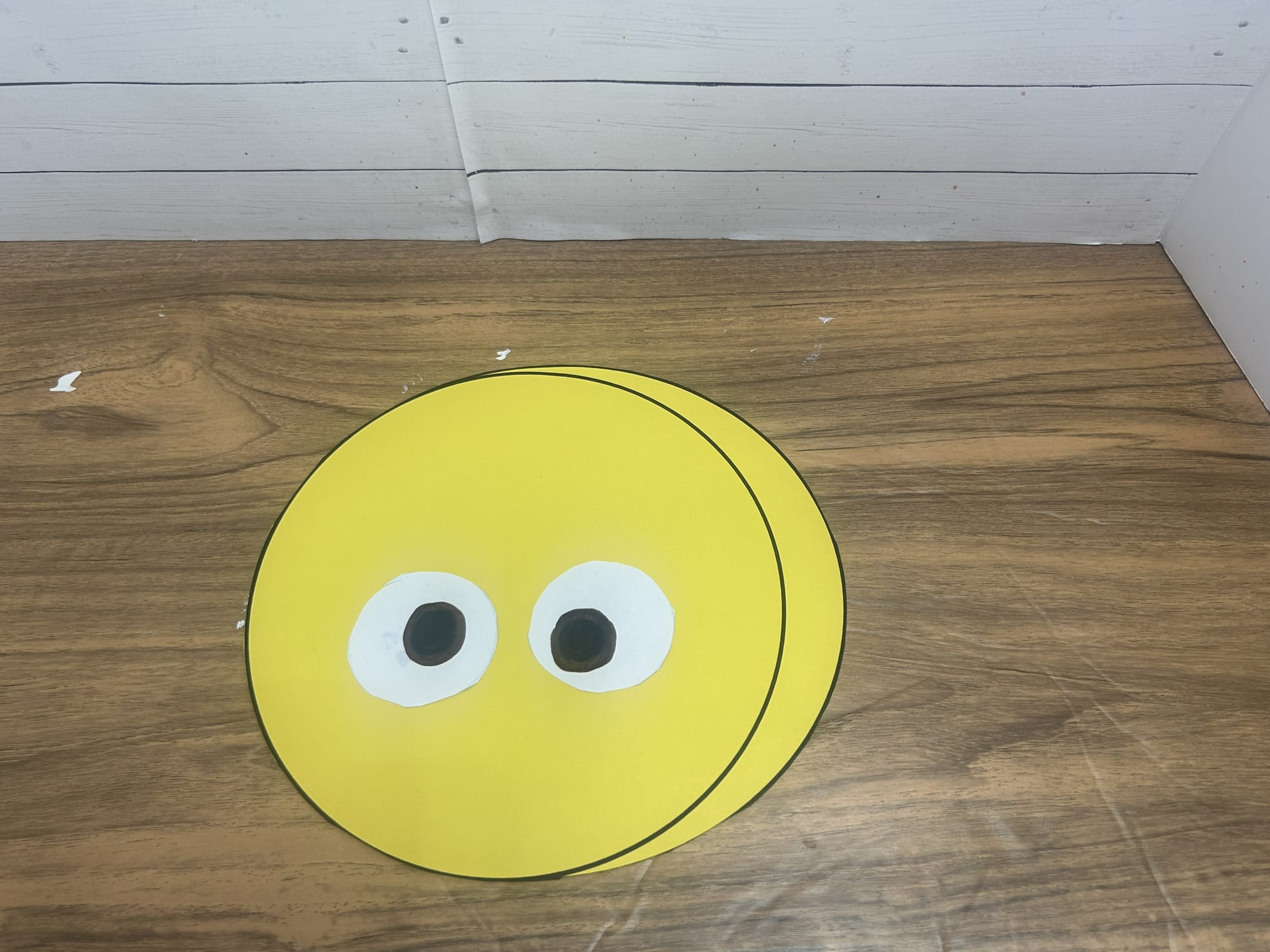Glue the white circles onto the yellow cheese shape. Using a black marker add pupils. Next, using the black marker add eyebrows. Use illustrations in the book to inspire choices for the eyes and eyebrows.