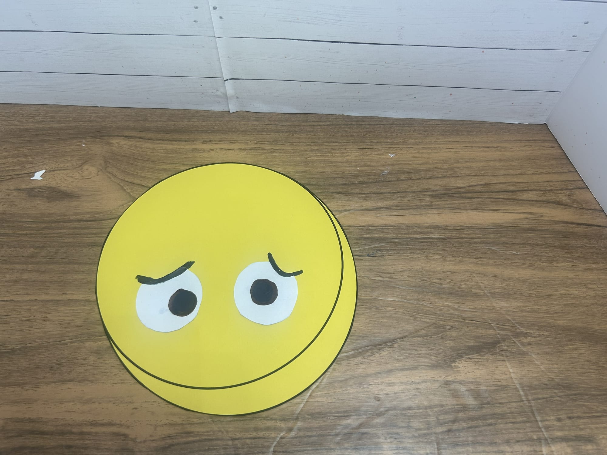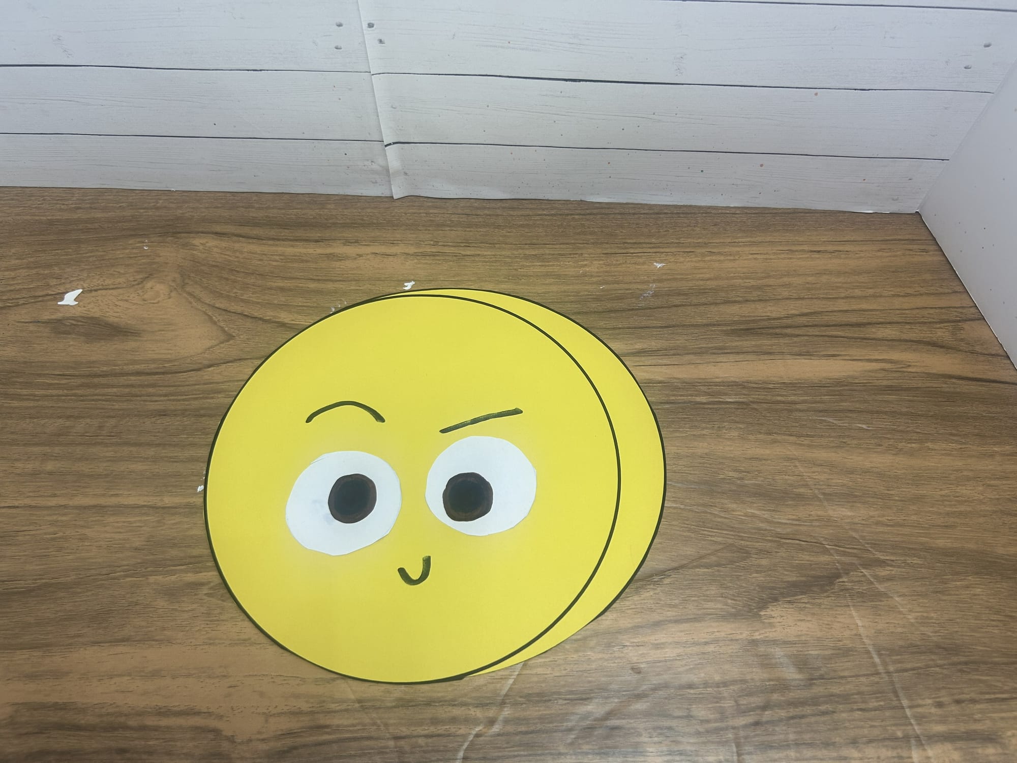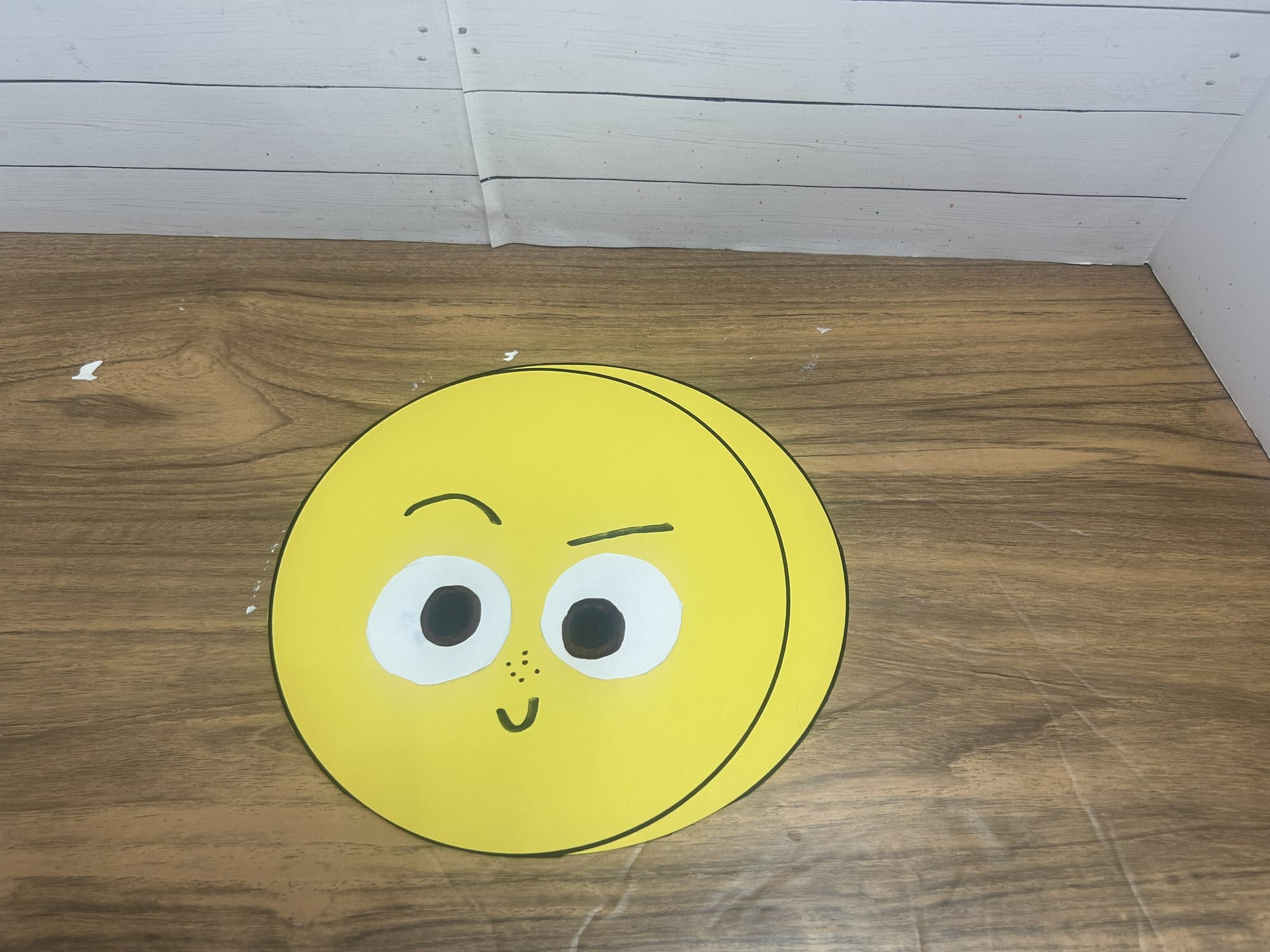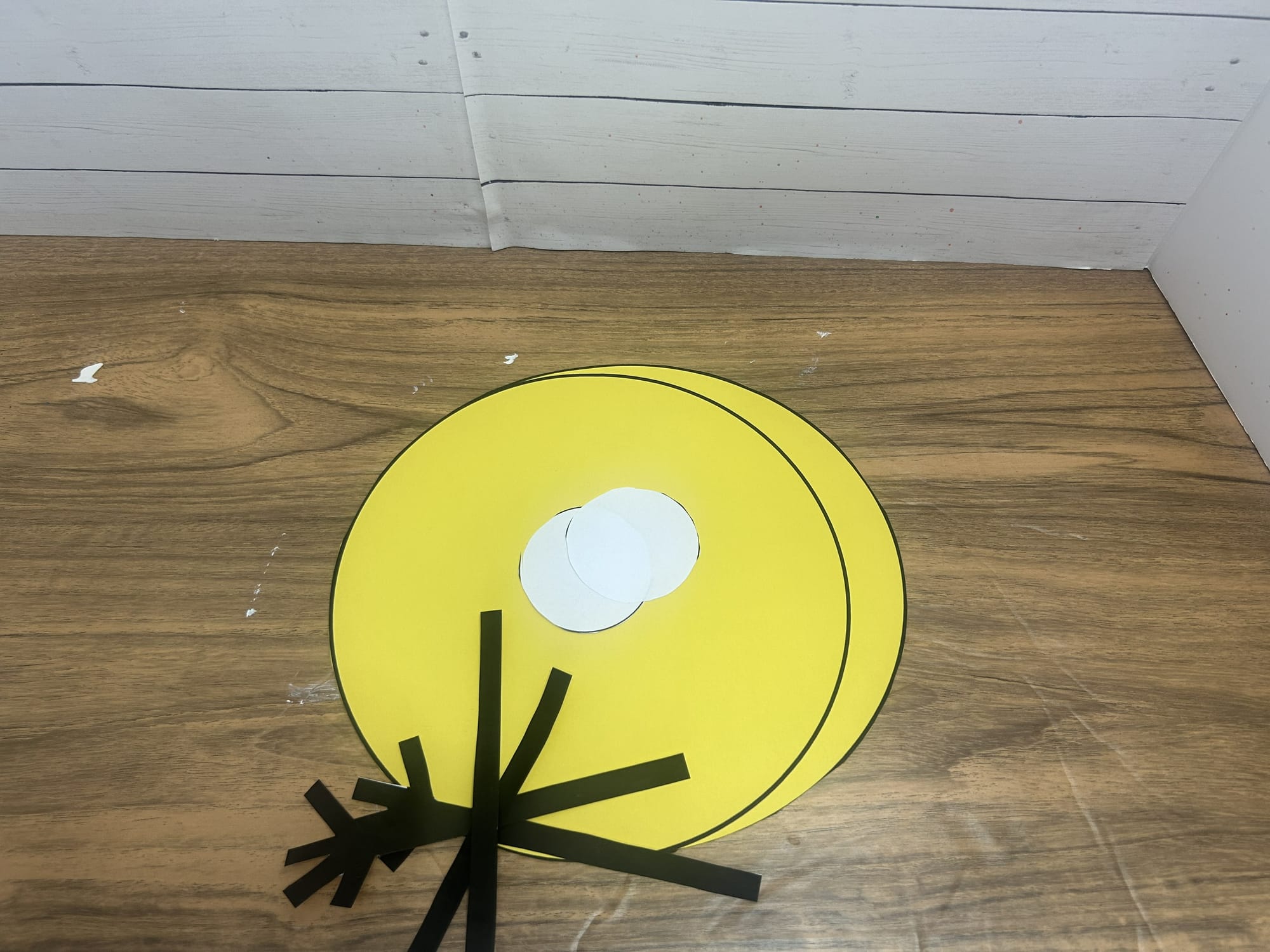 Glue the white circles onto the yellow cheese shape. Using a black marker add pupils. Next, using the black marker add eyebrows. Use illustrations in the book to inspire choices for the eyes and eyebrows.