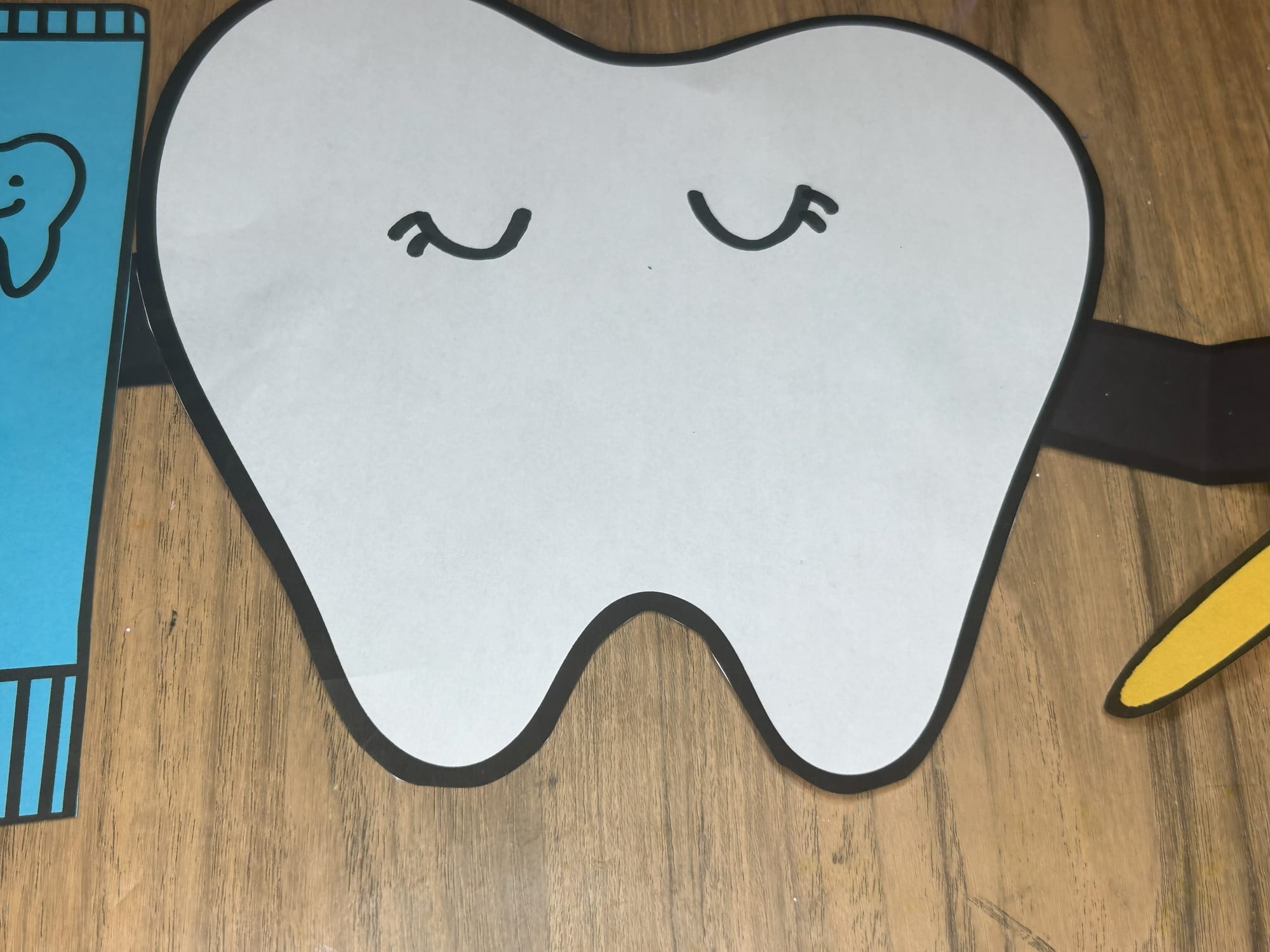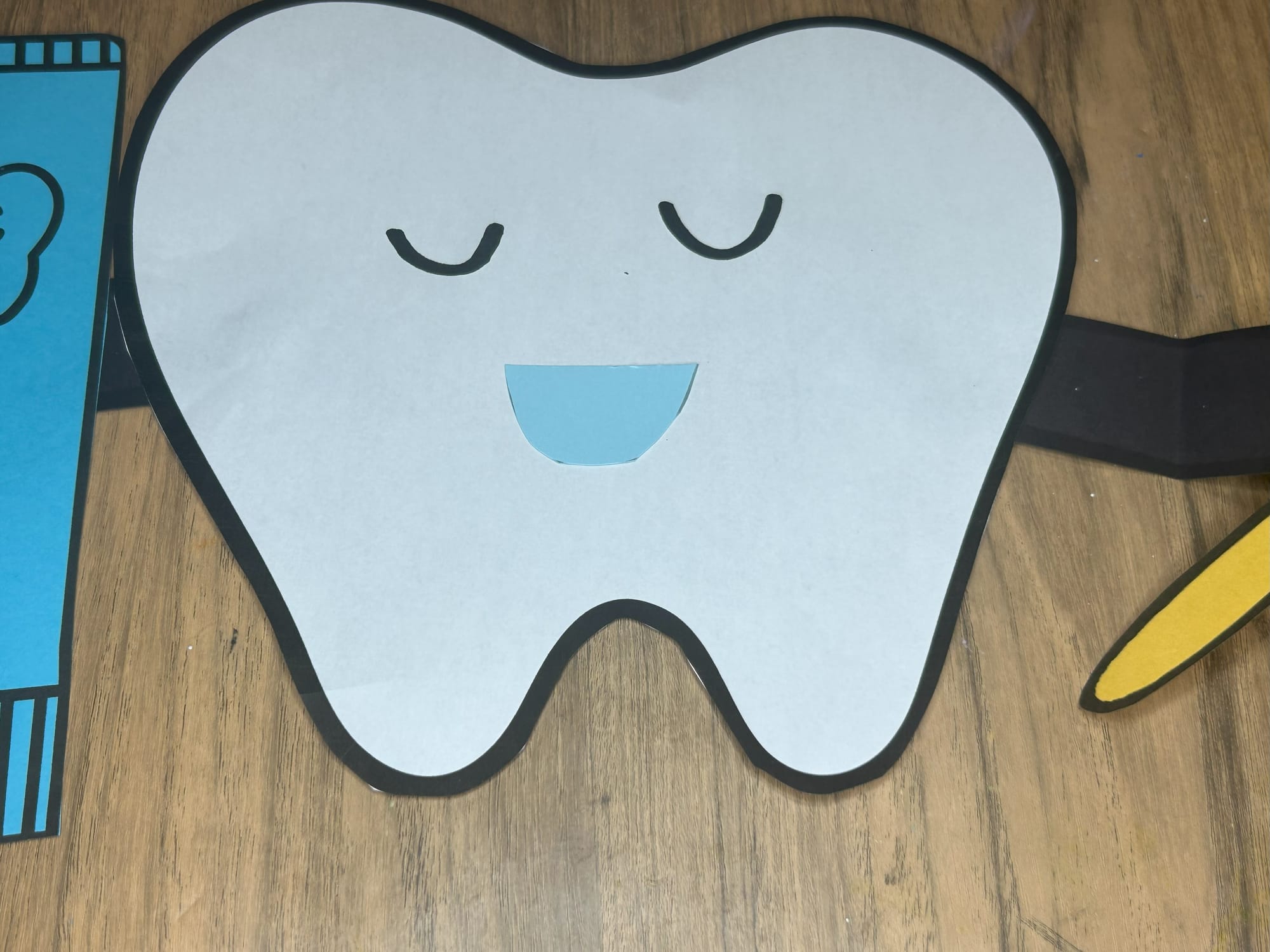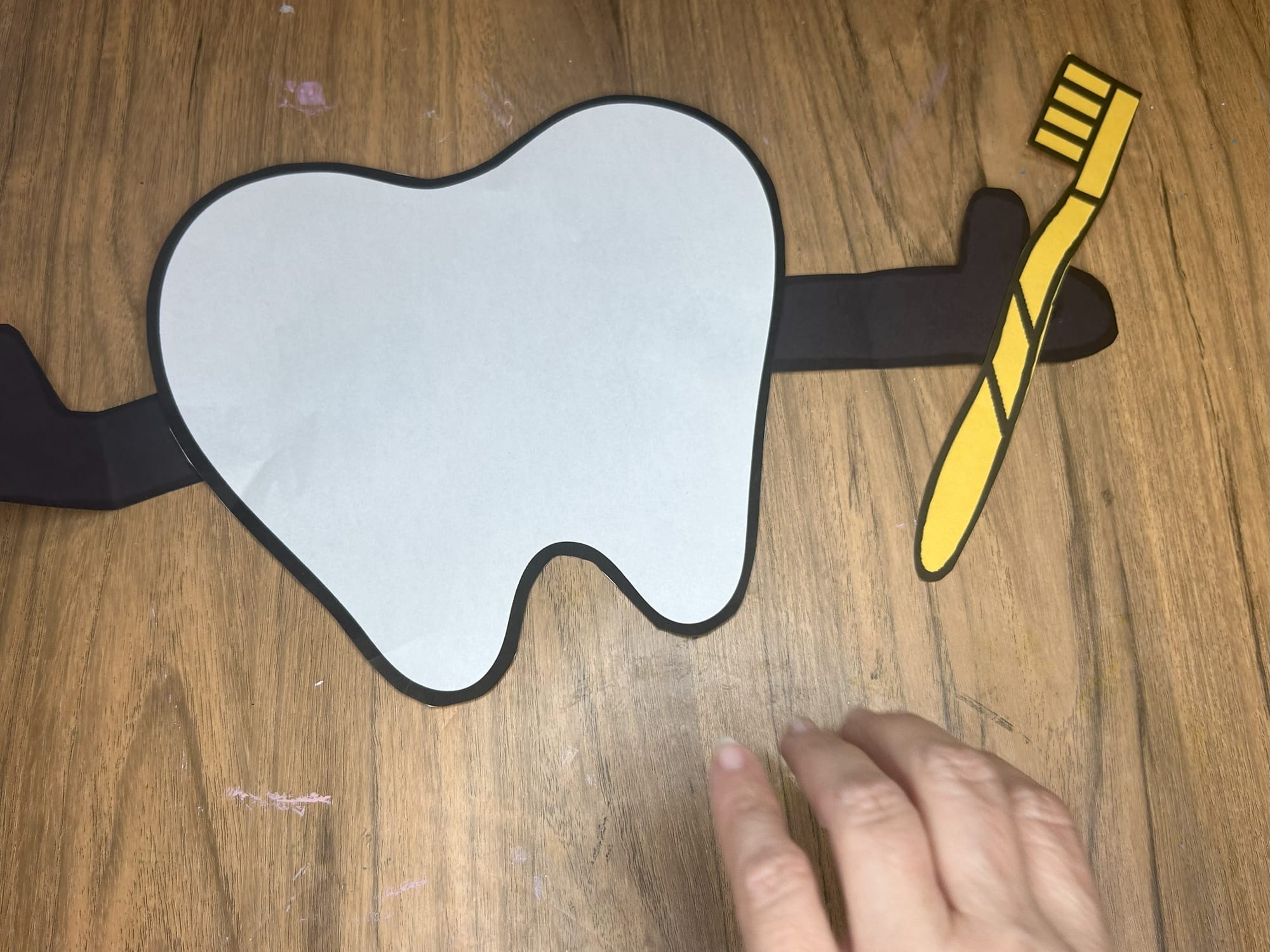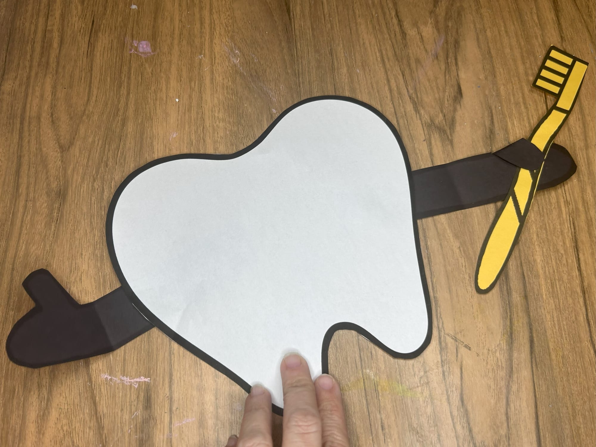 Glue the toothbrush and toothpaste onto the hands and arms of the tooth.