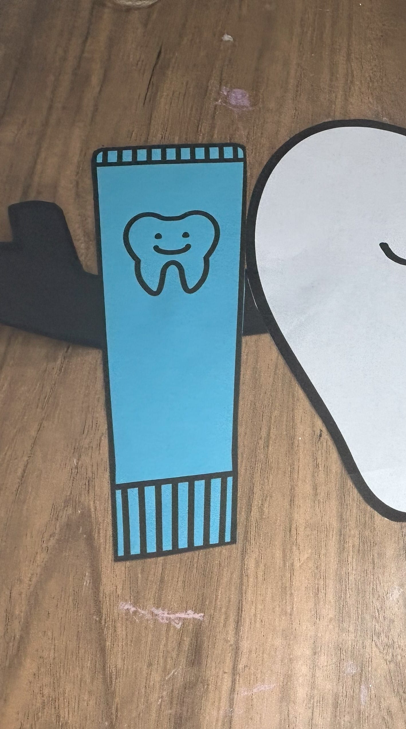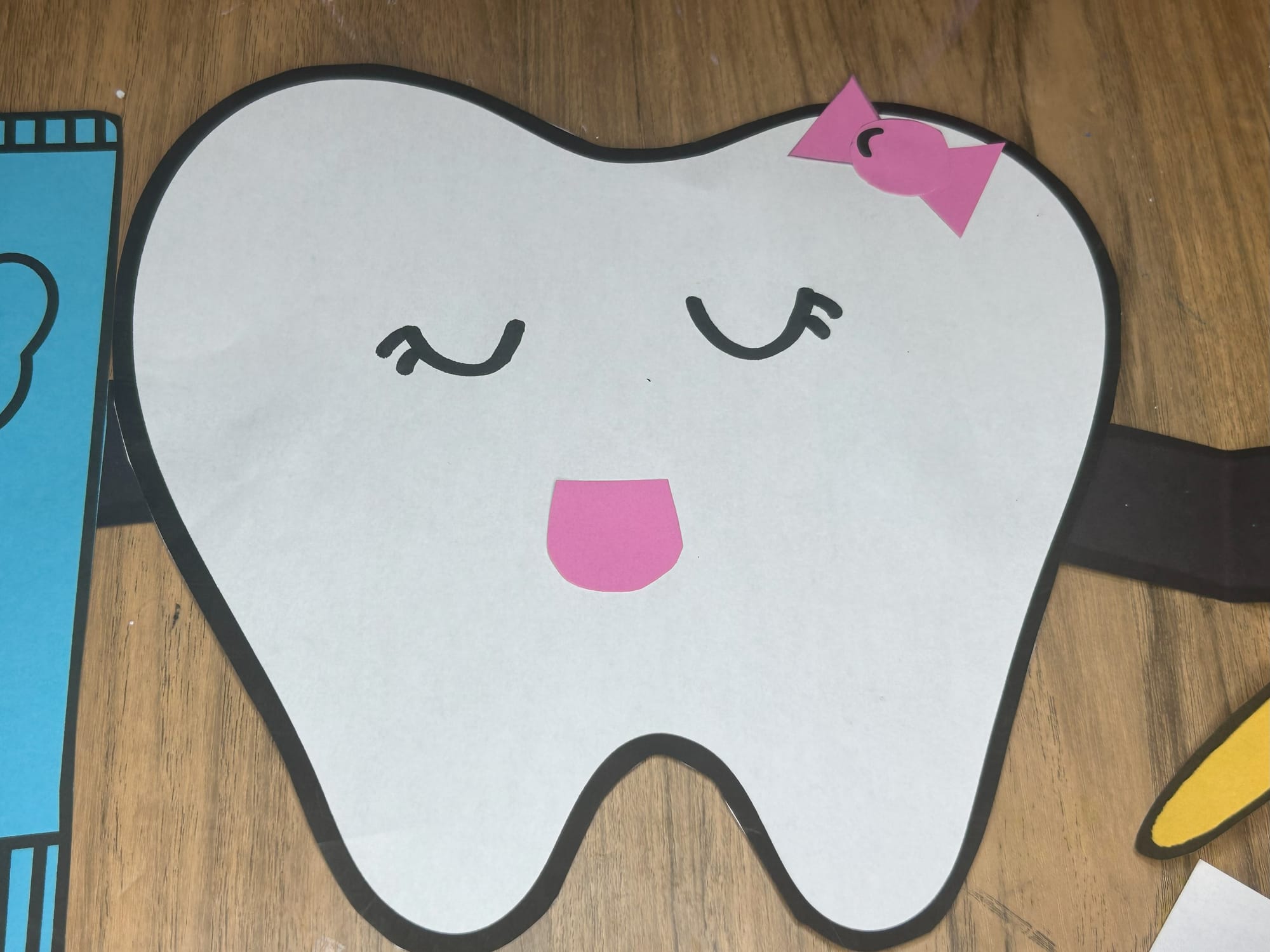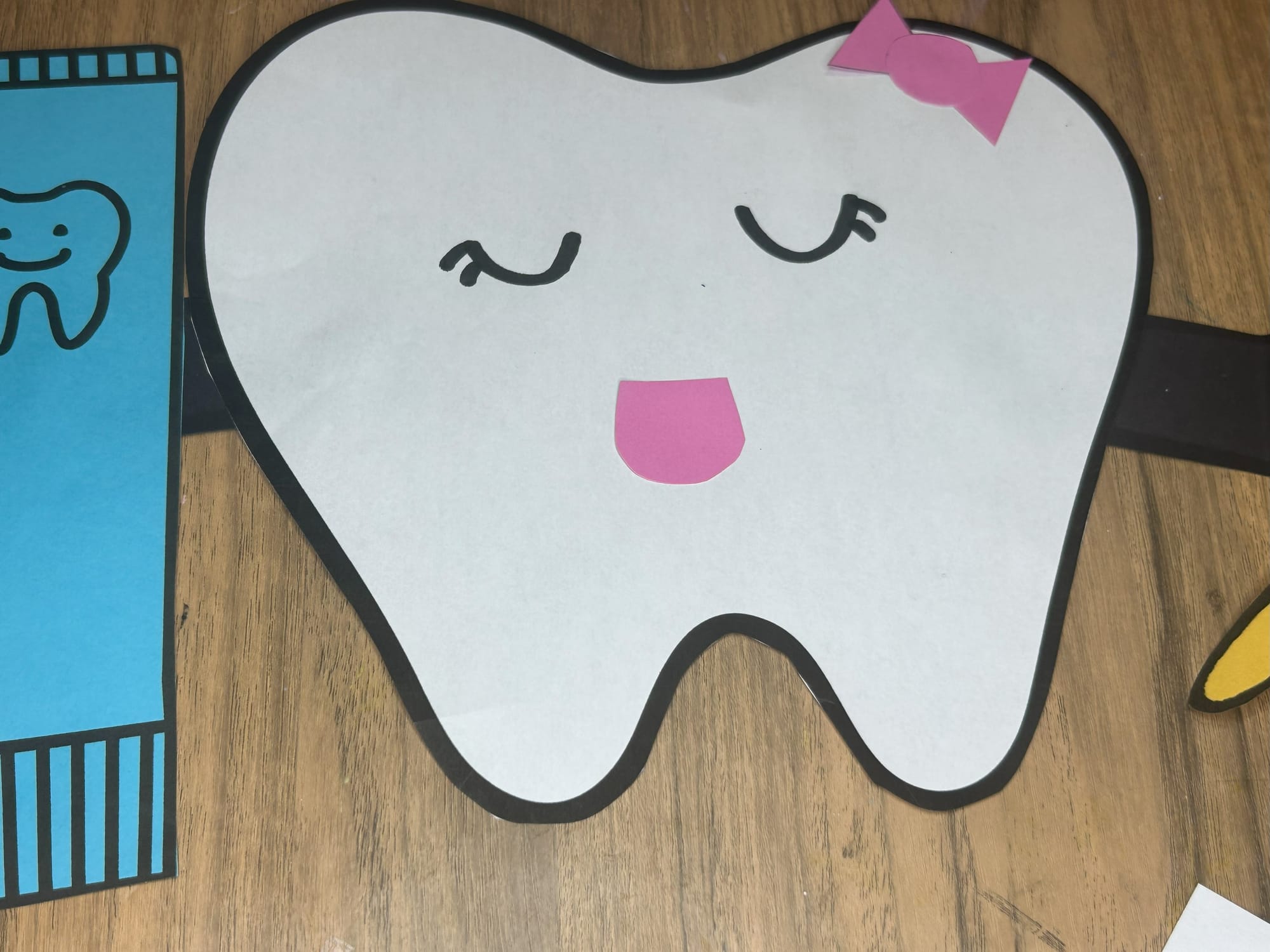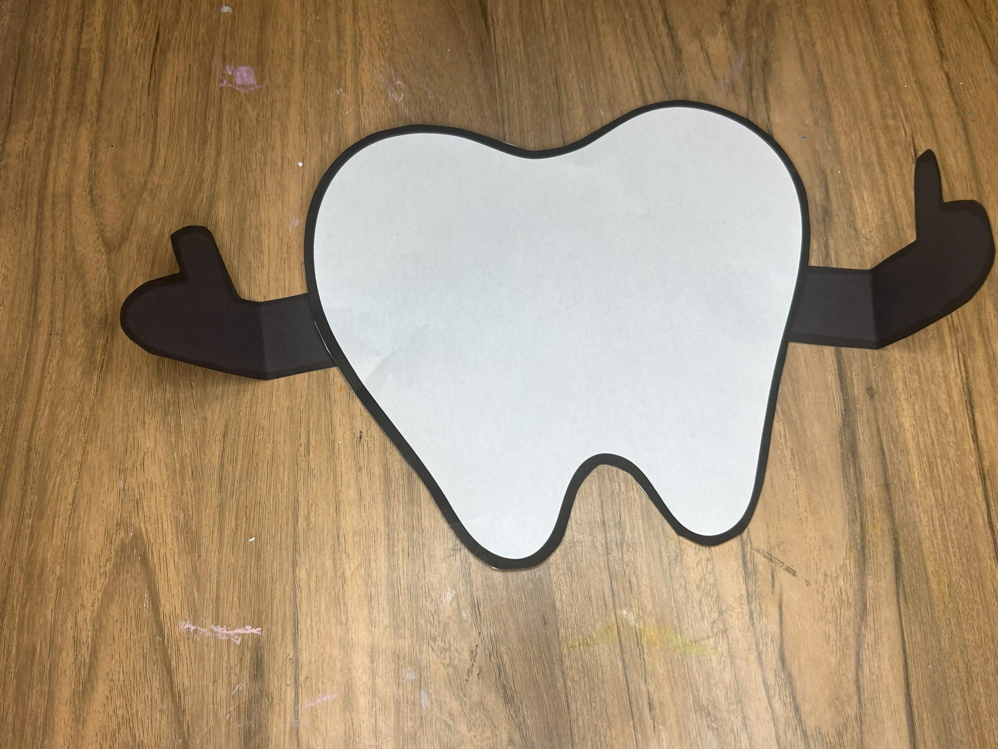 Glue the toothbrush and toothpaste onto the hands and arms of the tooth.
