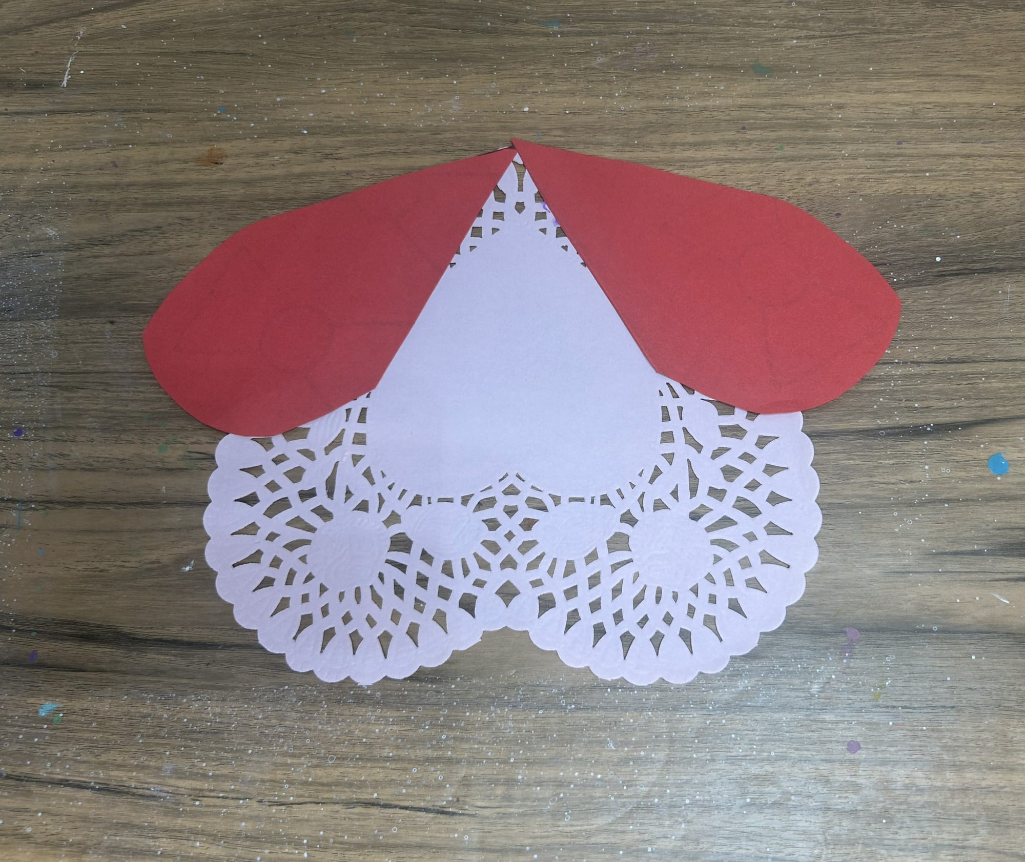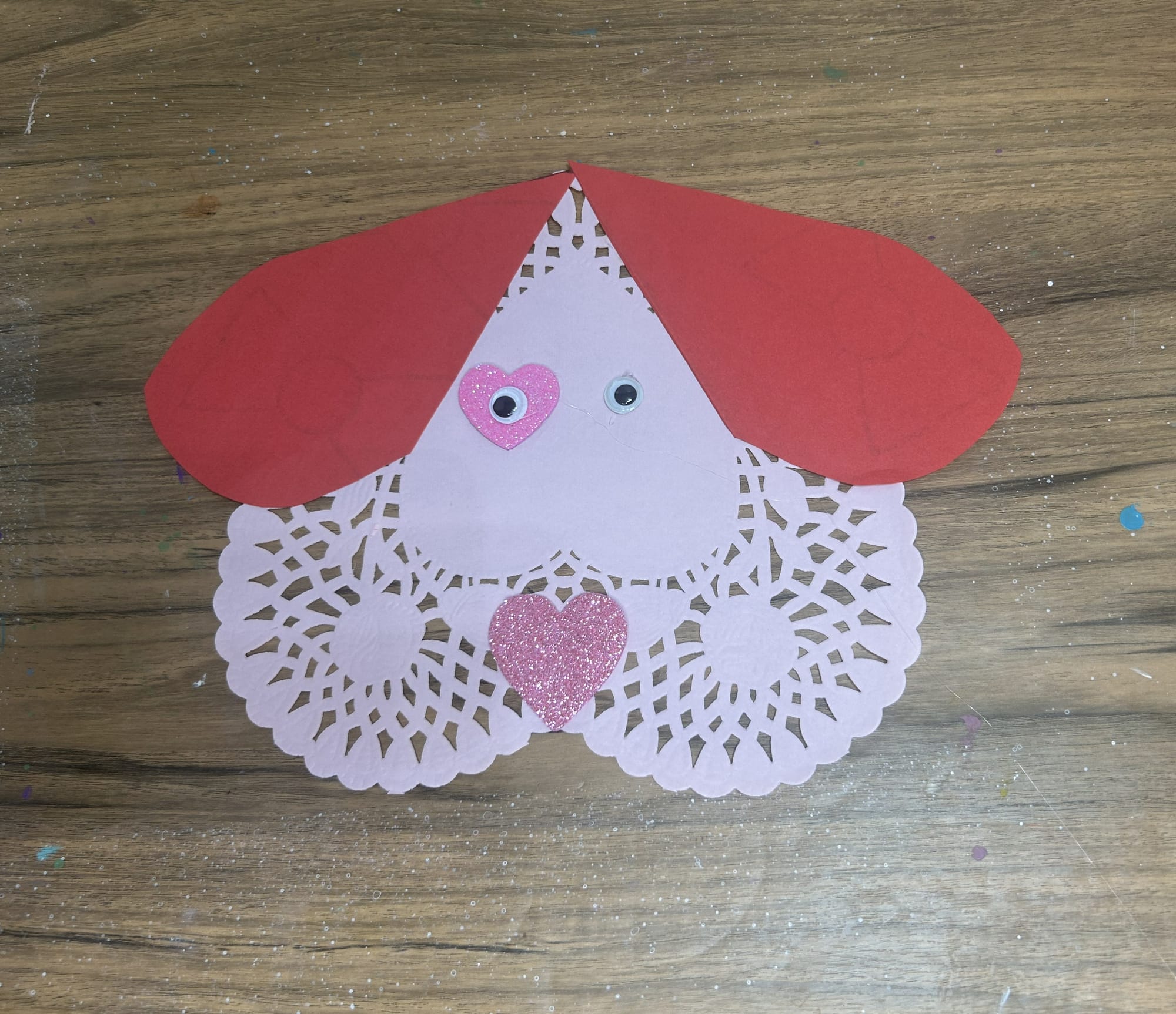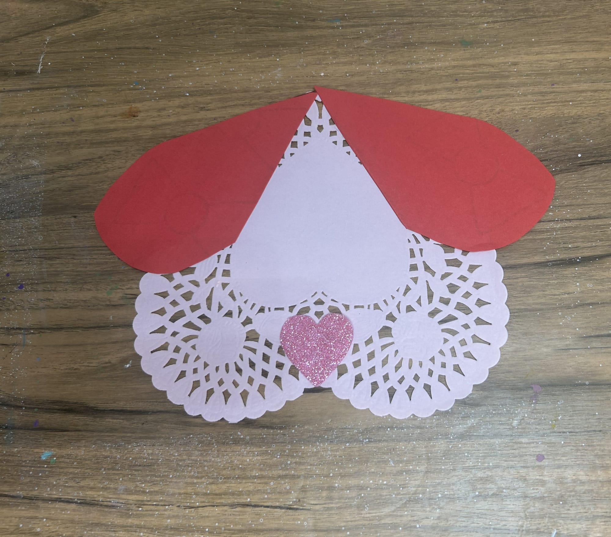 Glue the ears to the side of the heart. The rounded part of the heart will face down. Angle the pointed part of the heart to fit along the edge of the paper doily.
