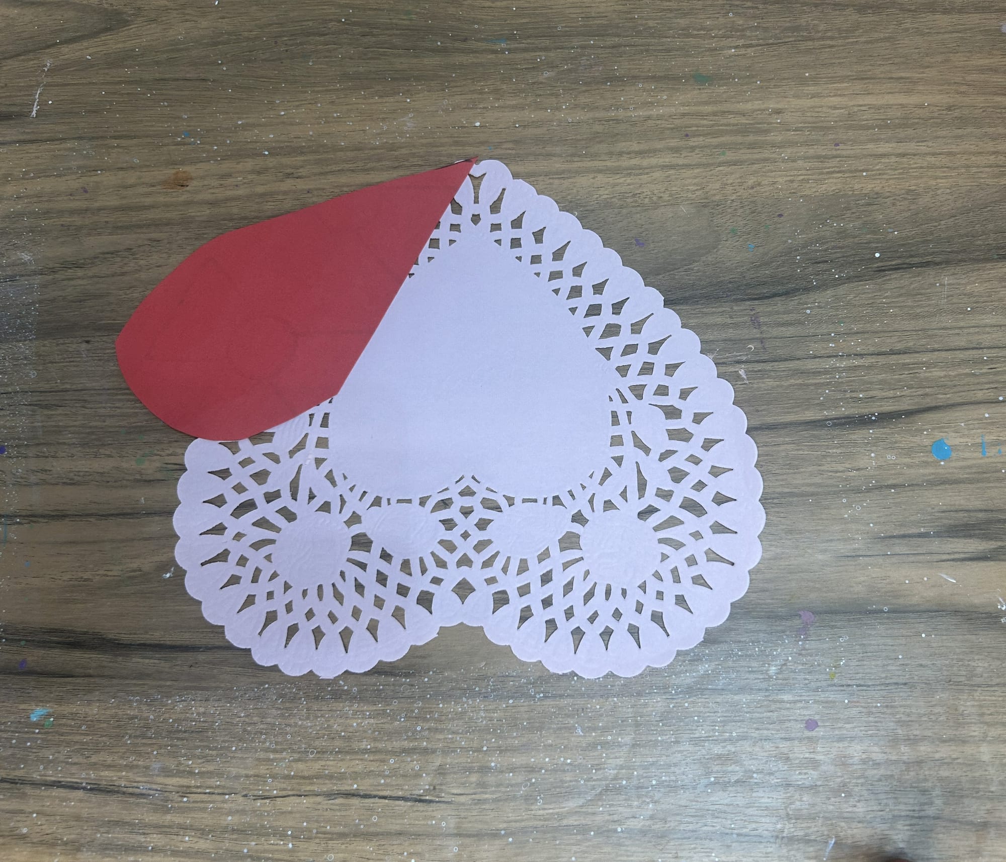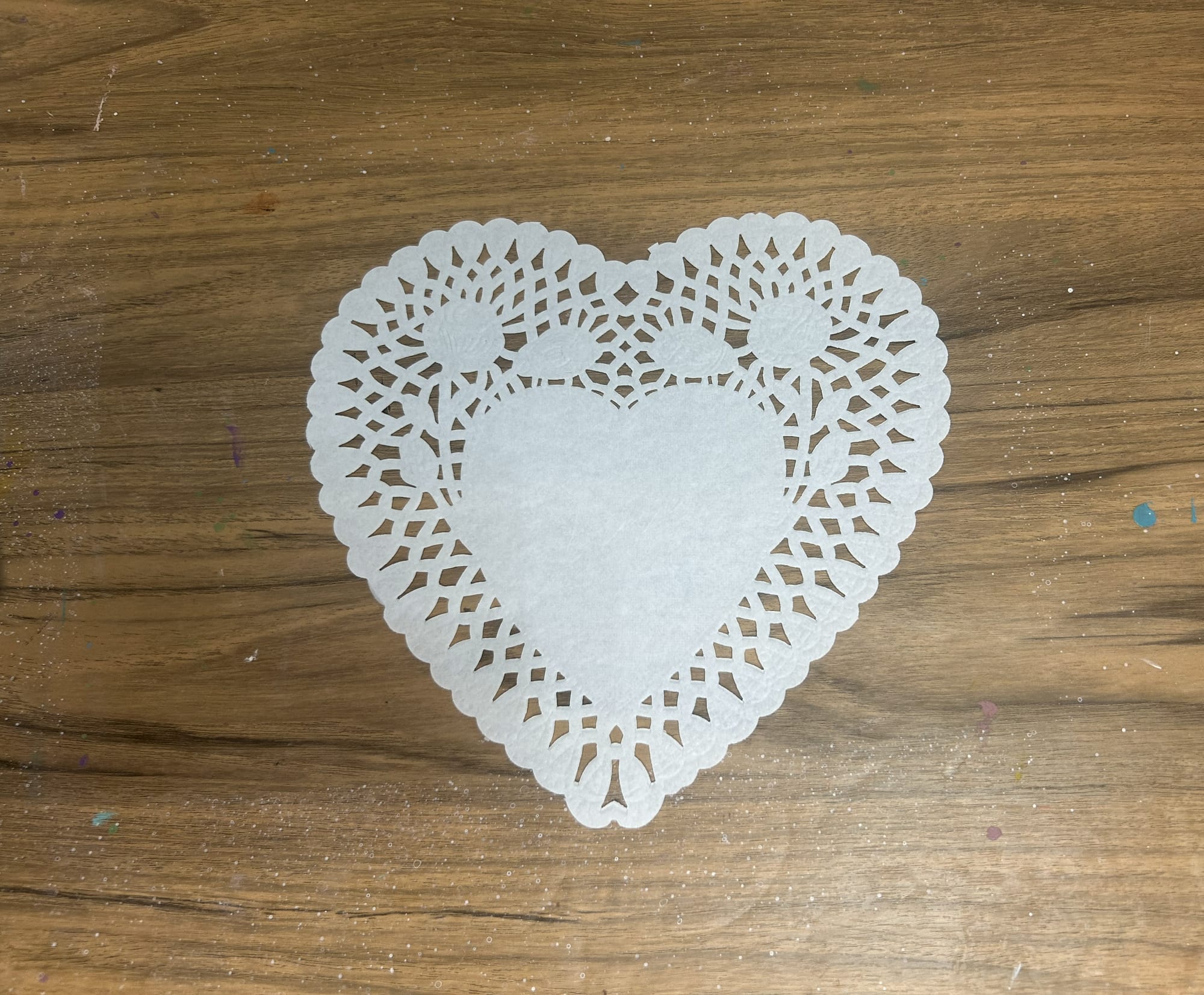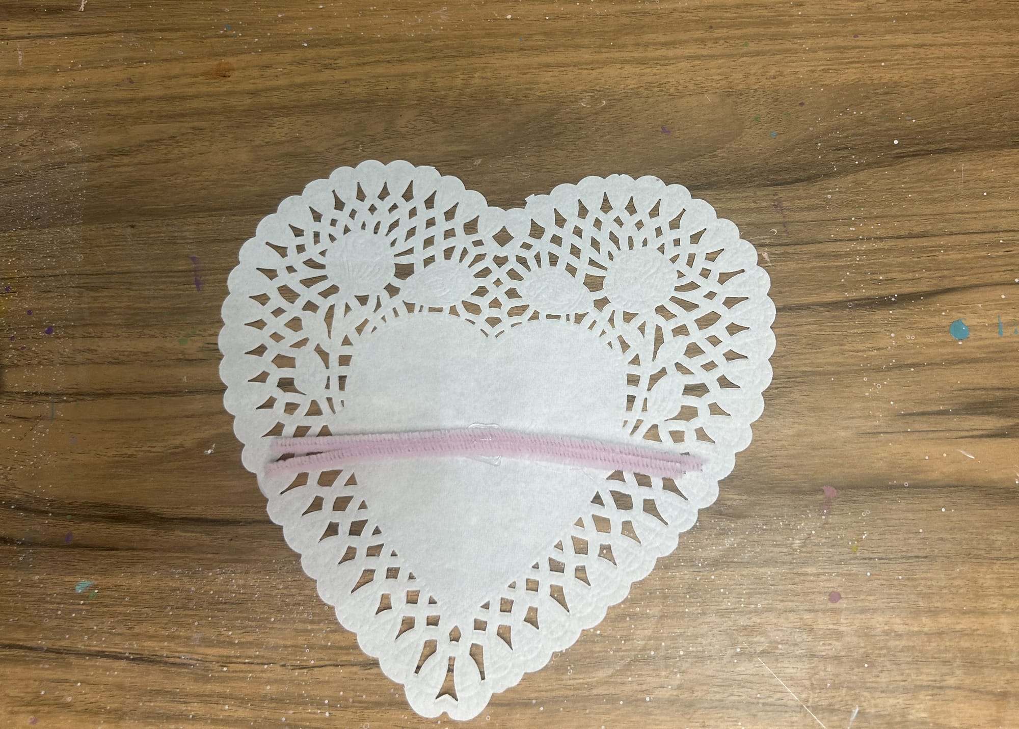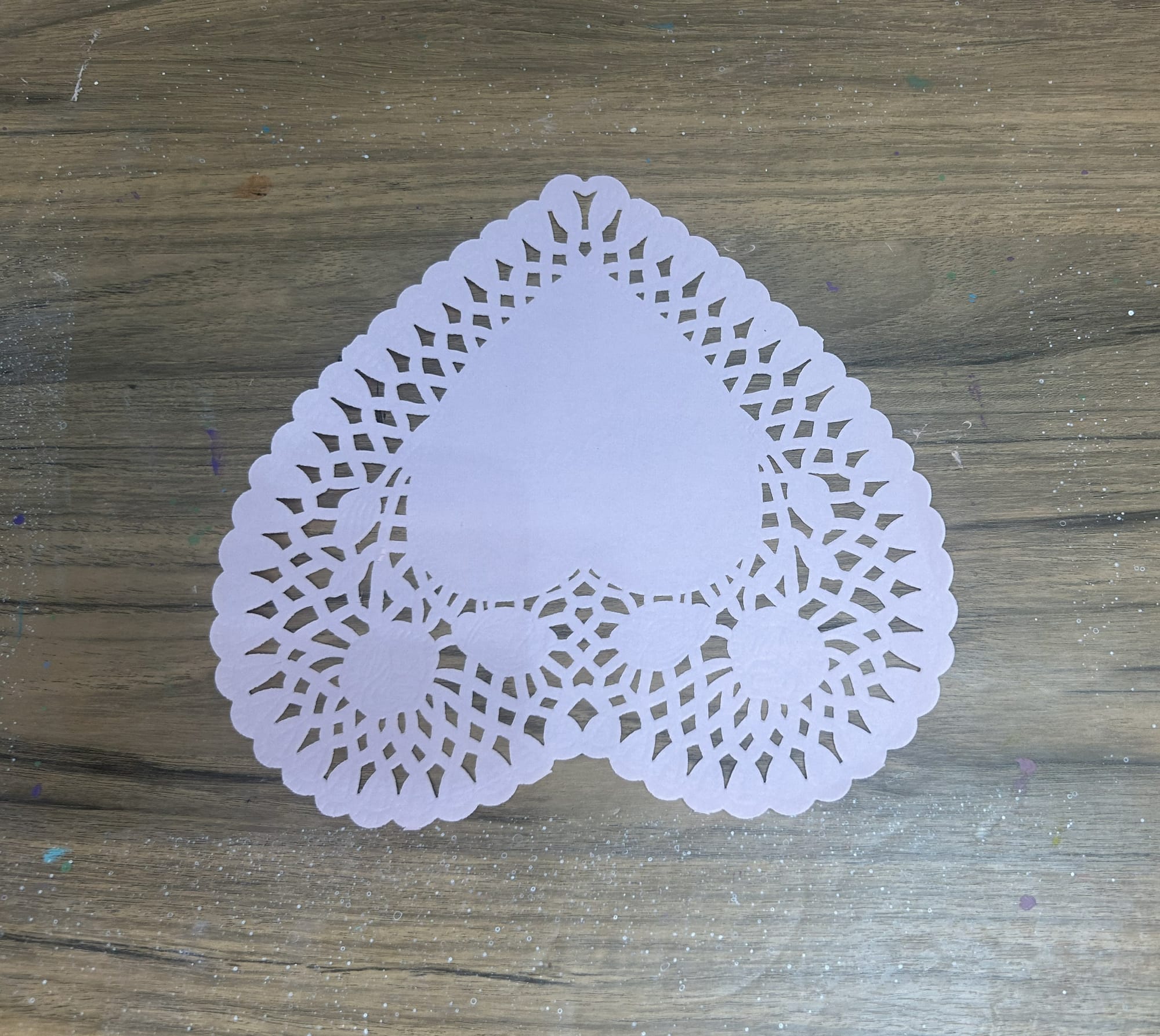 You can also create a heart shaped cat. To make this, start with a heart shaped paper doily. This time, place it on your work surface face up.