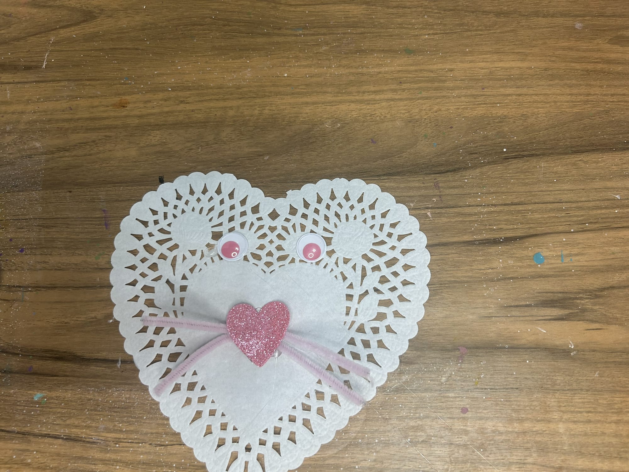 Add features using craft supplies and paper to make the cat's face. Googly eyes, pipe cleaner whiskers and a cut heart nose. Cut one pipe cleaner in half to make the whiskers. Then glue them into the doily and add a heart nose on top. Separate the pipe cleaners and form to make them look like whiskers.